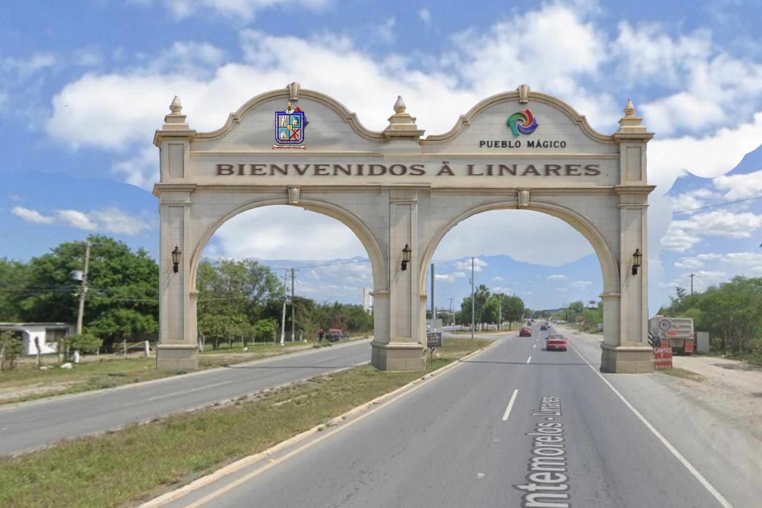 photorealistic architectural render of the main entrance arch to linares nuevo le n mexico symmetrical monumental stone gateway with three arches classical mexican architectural style clean and well proportioned geometry light beige natural stone material with subtle texture realistic stone joints soft wear but well maintained clear and sharp engraved text bienvenidos a linares perfectly centered and scaled official city coat of arms and pueblo m gico emblem accurately placed high detail no distortion wide boulevard passing under the arches smooth asphalt clear road markings minimal traffic for scale reference landscaped surroundings with trimmed grass native trees clean sidewalks lighting natural daylight soft midday sun global illumination realistic shadows balanced exposure camera eye level architectural photography wide angle lens 24 28mm centered composition strong symmetry verticals perfectly straight no distortion atmosphere clear blue sky with soft clouds high visibility realistic depth ultra high resolution pbr materials global illumination ambient occlusion cinematic realism professional architectural visualization no people no clutter no visual noise