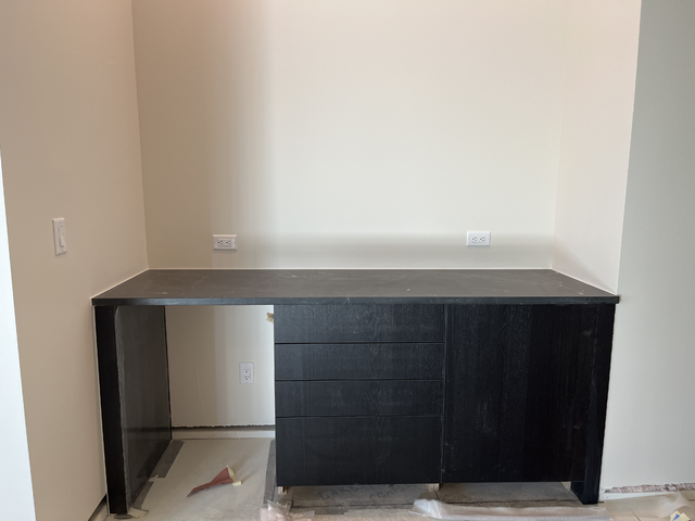 do not change the cabinets in any way preserve the exact cabinet colors materials finishes dimensions door and drawer styles hardware spacing alignment and all geometry exactly as shown do not alter the countertop shape backsplash appliances flooring lighting fixtures or wall structure only remove the construction materials clutter and mess from the scene clean the room and make it look finished and staged add a few simple tasteful home accessories appropriate for the style of the space but do not add or remove any furniture windows or architectural elements maintain the original lighting direction and realism enhance clarity and polish the photo while keeping the cabinetry and room design completely unchanged do not alter the lighting to keep the cabinet colors as they are in the image add cabinet pulls stage as a luxurious home office with a chair in the opening wall paper flooring and artwork