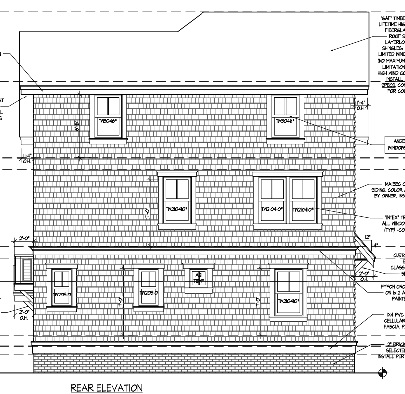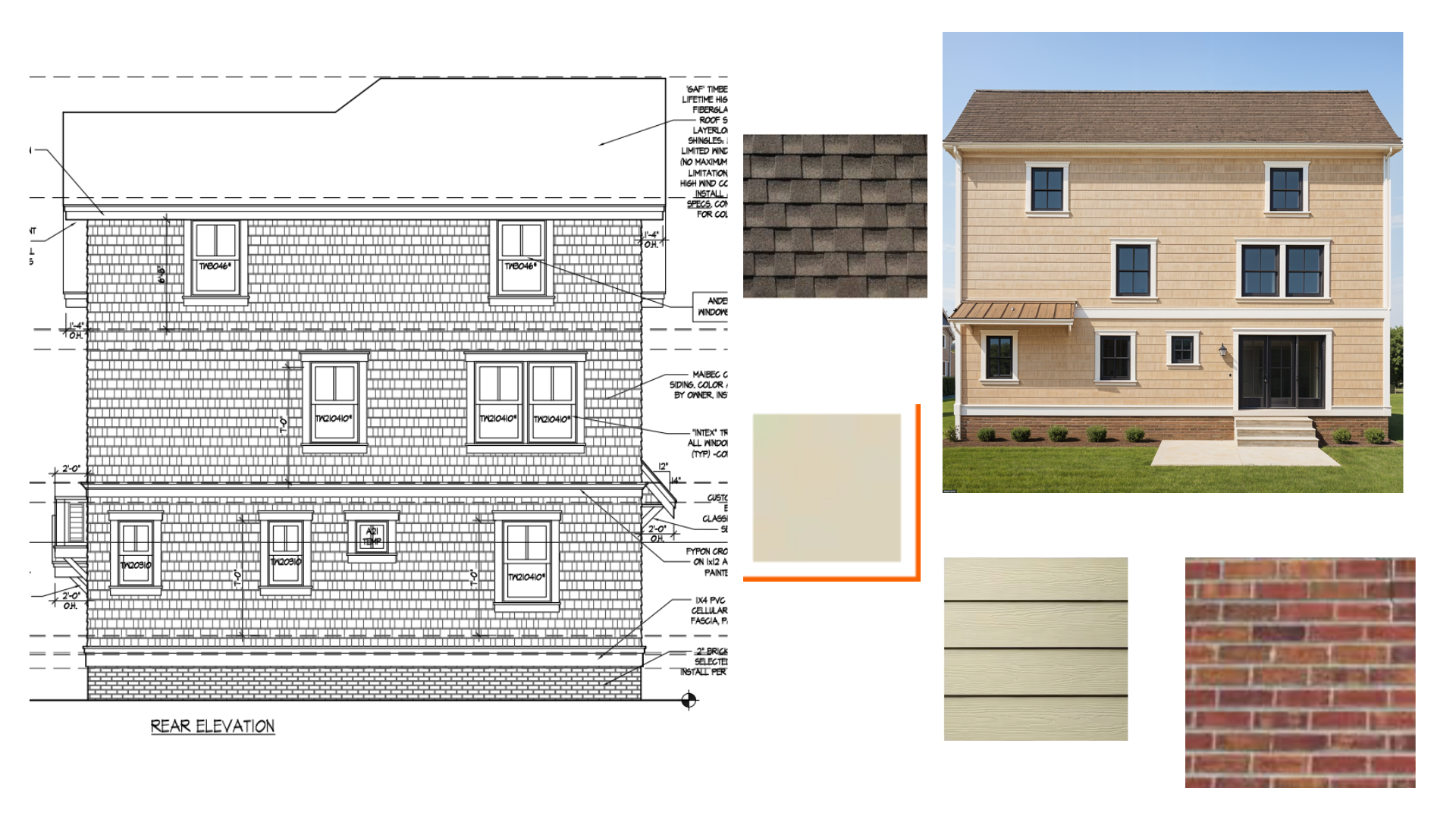 exterior shot a modern 3 story coastal style home on a raised red brick foundation siding in a sandy light tone white trim accents add crisp contrast with black framed windows repeated consistently roof design combines with dark brown shingles for texture the house rests on a wide concrete slab with simple steps minimal landscaping of grass and small shrubs and a clean coastal streetscape background proportions and window placement should stay consistent with the reference render with a cohesive uniform style on all elevations