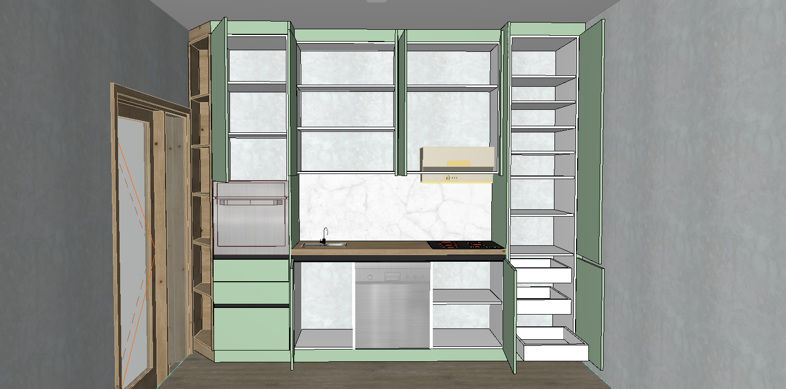 ultra realistic render of a modern kitchen interior originally modeled in archicad preserve exact geometry proportions and all design details do not redesign or modify any elements kitchen cabinet doors in light olive green matte finish with high quality pbr materials maintain fine details edges grooves and panel lines exactly as modeled no smoothing or simplification countertop in light natural wood realistic grain texture with correct scale and subtle imperfections front panel of the countertop in marble clearly defined veining sharp and clean apply realistic materials to all surfaces mdf wood marble and metal elements with accurate roughness reflections and micro textures very subtle not exaggerated natural daylight illumination from windows soft global illumination balanced exposure no added led lights no new elements no design changes soft realistic shadows ambient occlusion ray traced reflections keep original color tones especially the light olive cabinets accurate and not oversaturated ultra realistic render of a modern kitchen interior originally modeled in archicad preserve exact geometry proportions and all design details do not redesign or modify any elements kitchen cabinet doors in light olive green matte finish with high quality pbr materials maintain fine details edges grooves and panel lines exactly as modeled no smoothing or simplification countertop in light natural wood realistic grain texture with correct scale and subtle imperfections front panel of the countertop in marble clearly defined veining sharp and clean apply realistic materials to all surfaces mdf wood marble and metal elements with accurate roughness reflections and micro textures very subtle not exaggerated natural daylight illumination from windows soft global illumination balanced exposure no added led lights no new elements no design changes soft realistic shadows ambient occlusion ray traced reflections keep original color tones especially the light olive cabinets accurate and not oversaturated camera at eye level slight depth of field sharp focus on kitchen details photorealistic rendering high resolution no stylization no blur no loss of detail