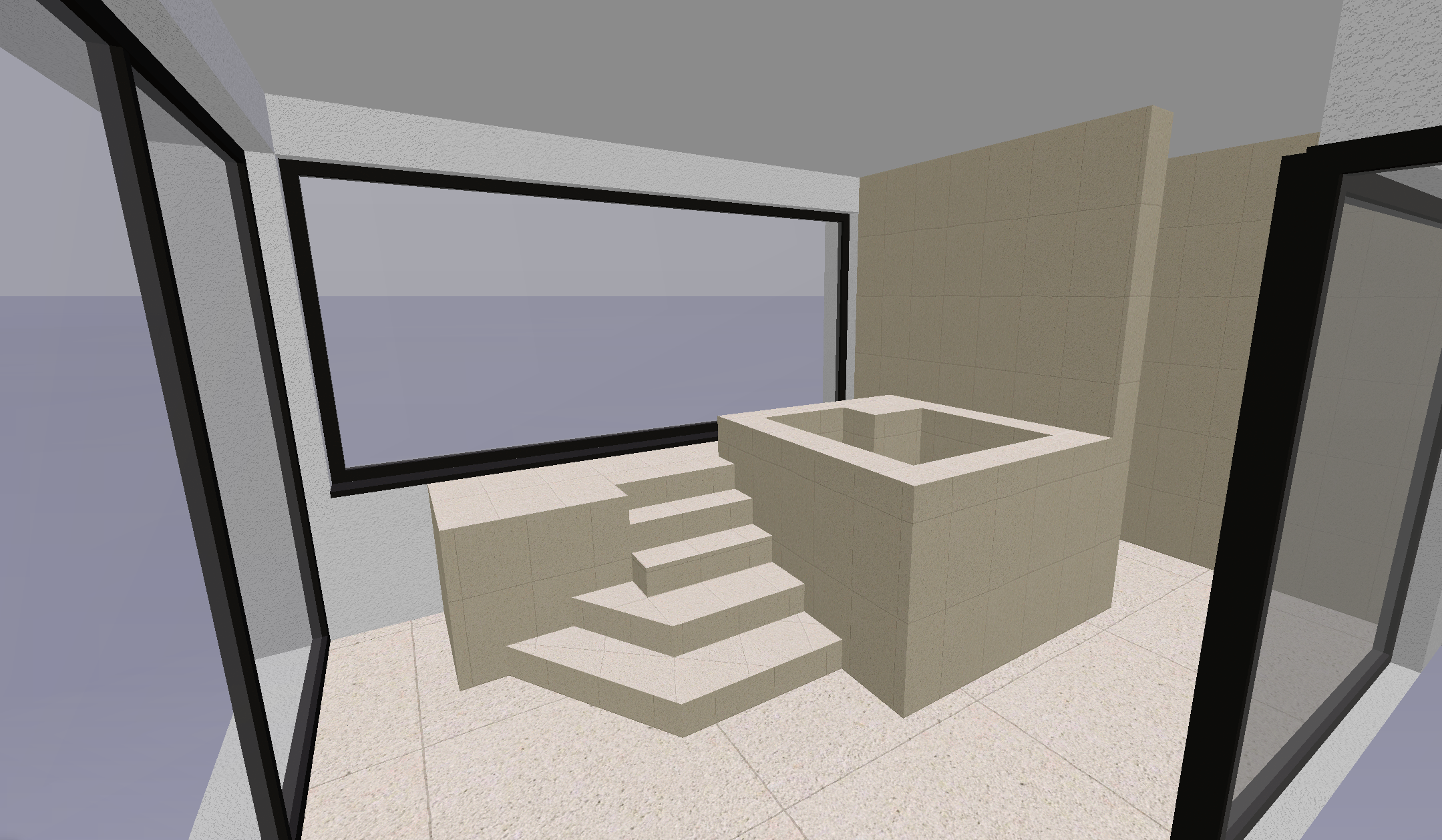 genau dieses rendering berarbeiten fotorealistisches innenraum foto exakt dieselbe perspektive und kameraposition wie das hochgeladene referenzbild 100 identische raumgeometrie im aussenbereich kleinst dtische industrieumgebung durch die fenster sichtbar rechts hinten ist die dusche auf der linken seite eine treppe mit indirekter beleuchtung der untersten zwei tritte vollfl chige horizontale jalousien ausserhalb der fenster beim fenster in front sind die jalousien komplett unten alle beigen w nde und der beige boden ist homogener hellbeiger kalkstein visso montenegro platten 80x40 cm alle anderen w nde und die decke sind weissputz ral 9016 das fenster in front hat auf beiden seiten einen transparenten raumhohen beigen vorhang beim fenster auf der linken seite ebenfalls ein raumhoher vorhang rechts hinter der wanne ein modernes bild an der wand am boden steht vorne im bild auf der linken seite eine grosse moderne topfpflanze auf der linken seite hat es auf dem podest b cher und accessoires eine sehr h bsche asiatische frau um 25 sitzt im mit wasser gef llten tauchbecken raum zus tzlich k nstlich ausleuchten mit schwarzen runden deckenspots sanfte realistische schatten weiches nat rliches tageslicht mit schatten der jalousien an den w nden raum hinten rechts hell ausleuchten realistische materialien hochwertige oberfl chenreflexionen nat rliche farbwiedergabe golden hour feeling hell ausleuchten das bild muss wie eine professionelle fotografie aussehen es soll ein echtes und reales foto sein canon eos r5 35 mm festbrennweite f 2 8 hyperrealistisch dslr qualit t raw aufnahme 8k aufl sung extrem scharf perfekte tiefensch rfe professionelle architekturfotografie