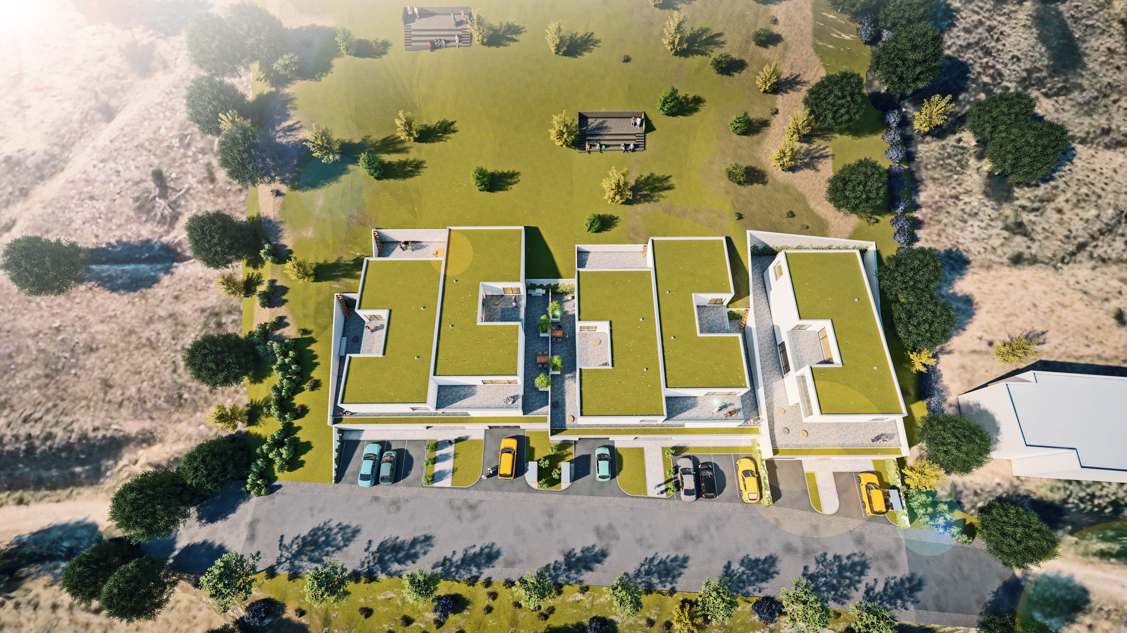 important preserve the existing geometry and the existing context exactly as provided do not modify alter reinterpret add remove scale or reshape any geometry do not change the site surroundings street layout neighboring buildings vegetation or context elements do not modify geometry scale proportions buildings road layout sidewalks or surrounding context in any way do not change text photorealistic architectural rendering clean and balanced contrast calm cinematic mood style contemporary european residential architecture minimalist premium understated include people subtle motion blur for realism make the light warmer by 30