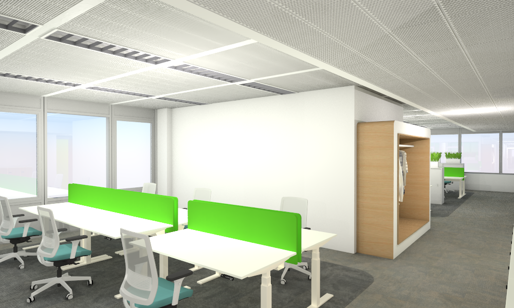 transformiere das b ro in ein ph nomenalistisches rendering mit naturalistischer atmosph re keine ver nderung der raumproportionen und belasse die exakte position der tische und st hle belasse die farben und erg nze feine textile texturen auf den gr nen fl chen erg nze vereinzelt auf den tischen postits tassen stifte und laptops der rahmen der st hle soll in schwarz erg nzt werden belasse die position und die farben der m bel