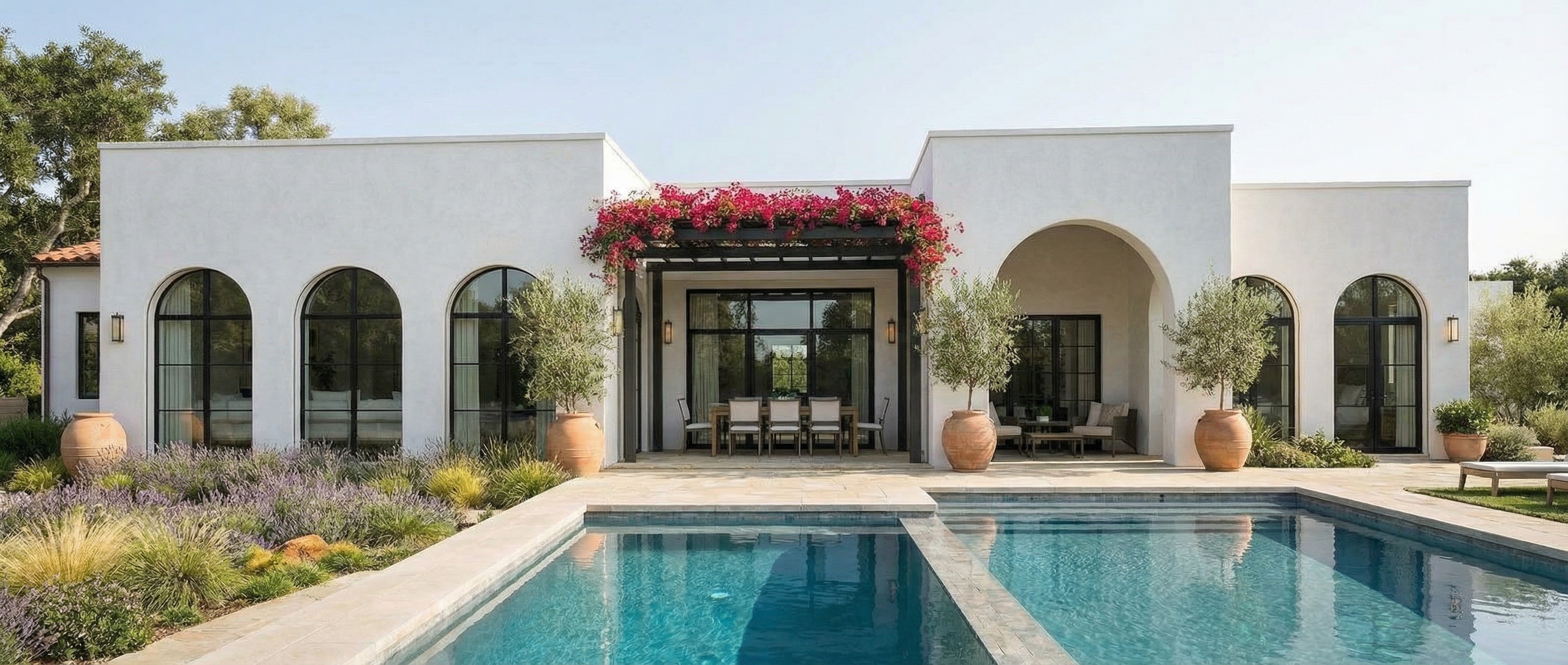 keep the white bright stucco add thick linear modern stucco band at the top of walls with drip edge modern spanish design with linear pool