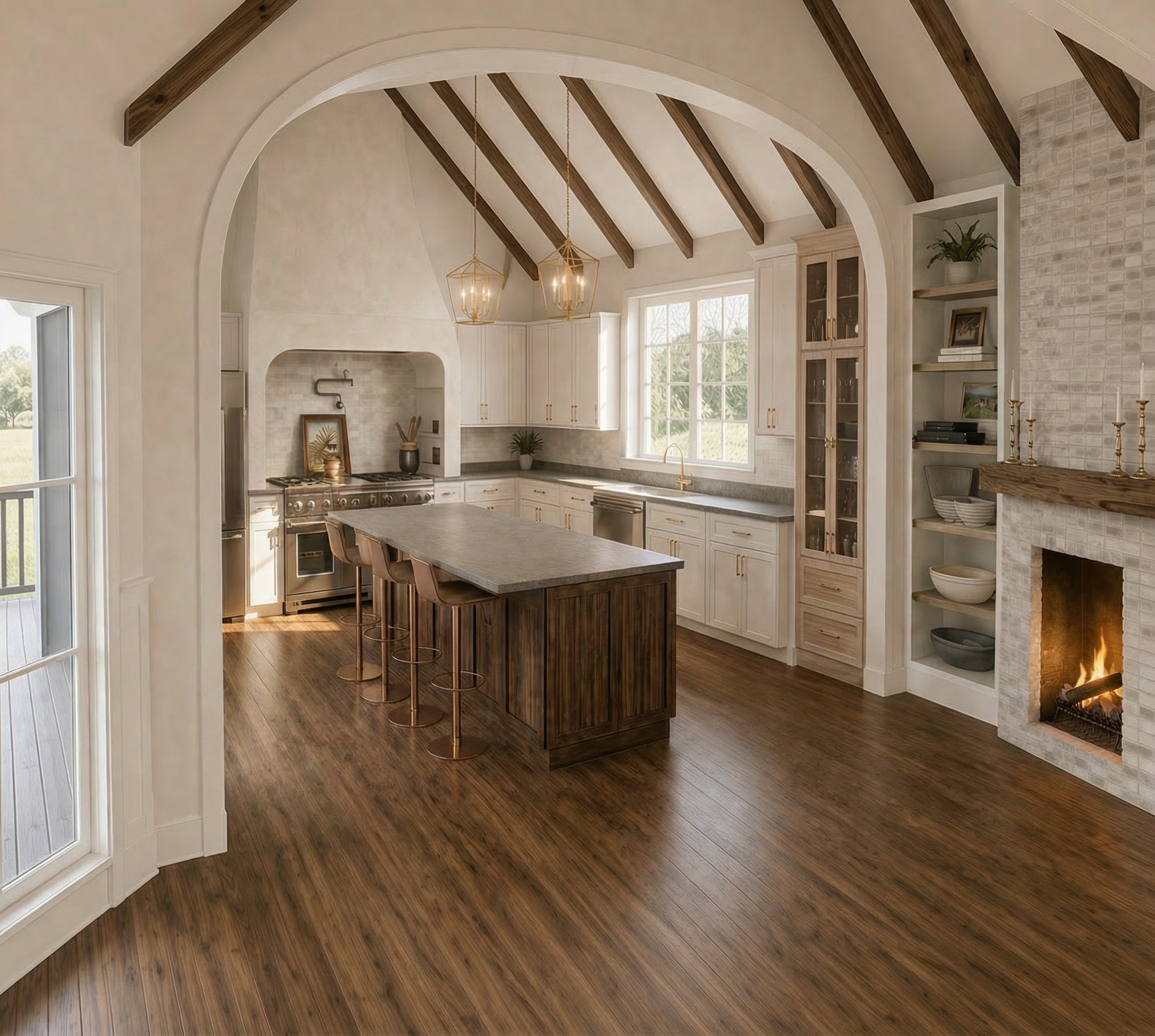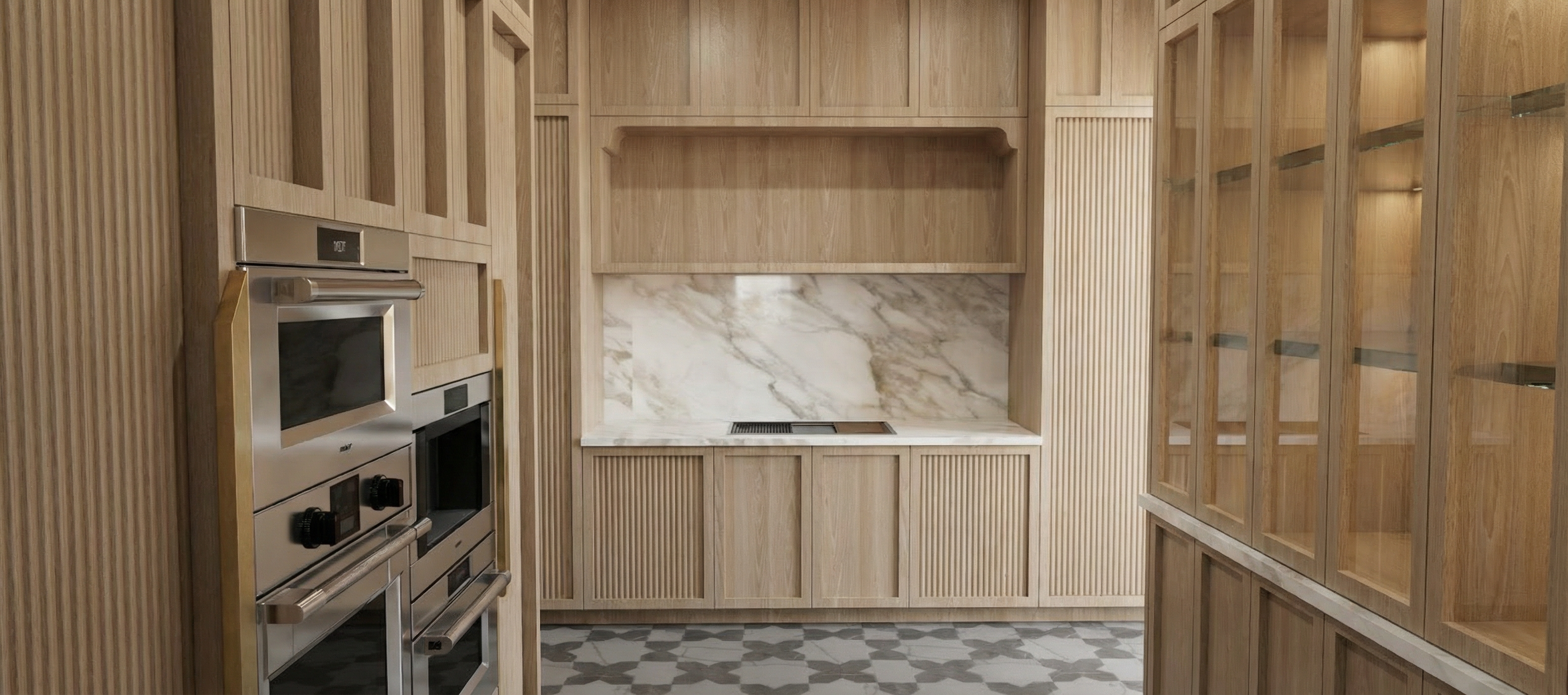 photorealistic interior elevation white oak flat panel cabinetry darker wood trim dark log header at top of elevation 3 sconces attached directly to full width mirror brass plumbing opening to right wall to left