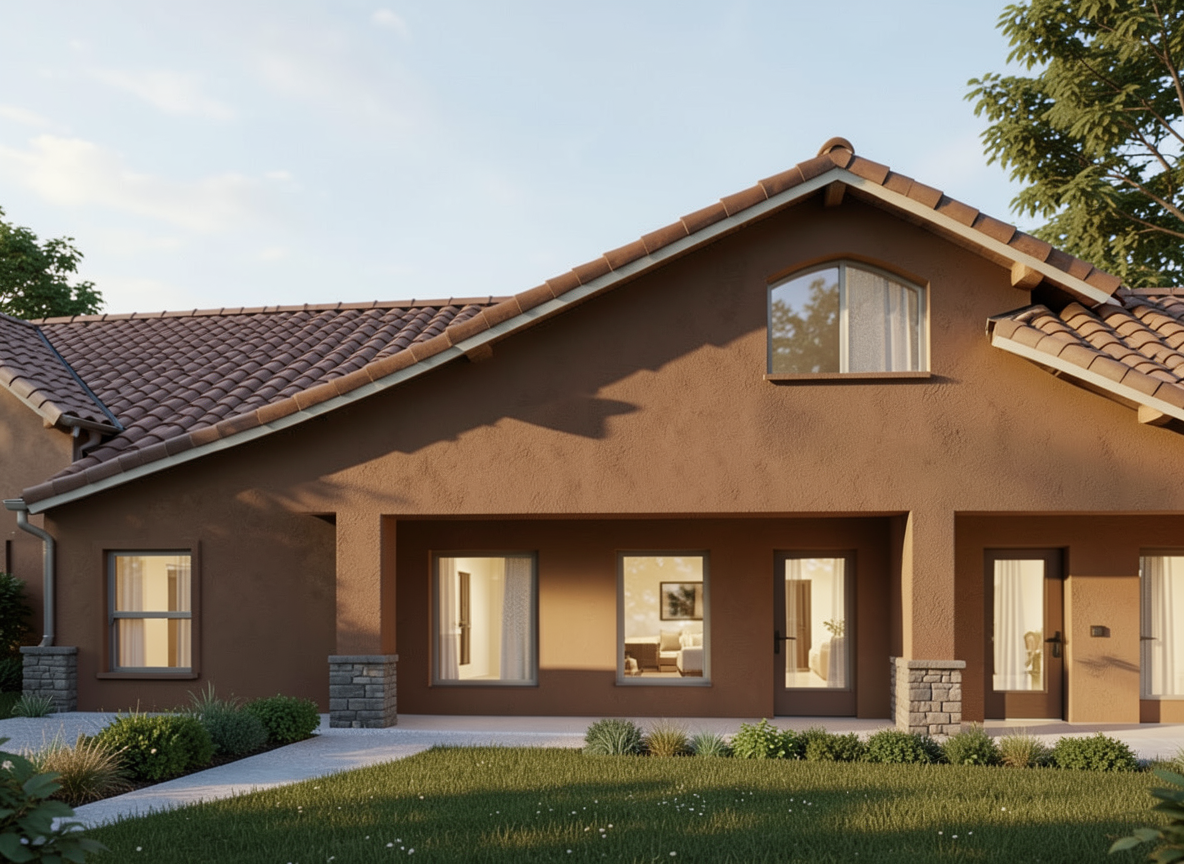 add modern club chairs with yellow cushions add small pink bougainvillea add more grass and palm trees put the firepit in front of the window with 4 club chairs enclose the porch on the left end with glass