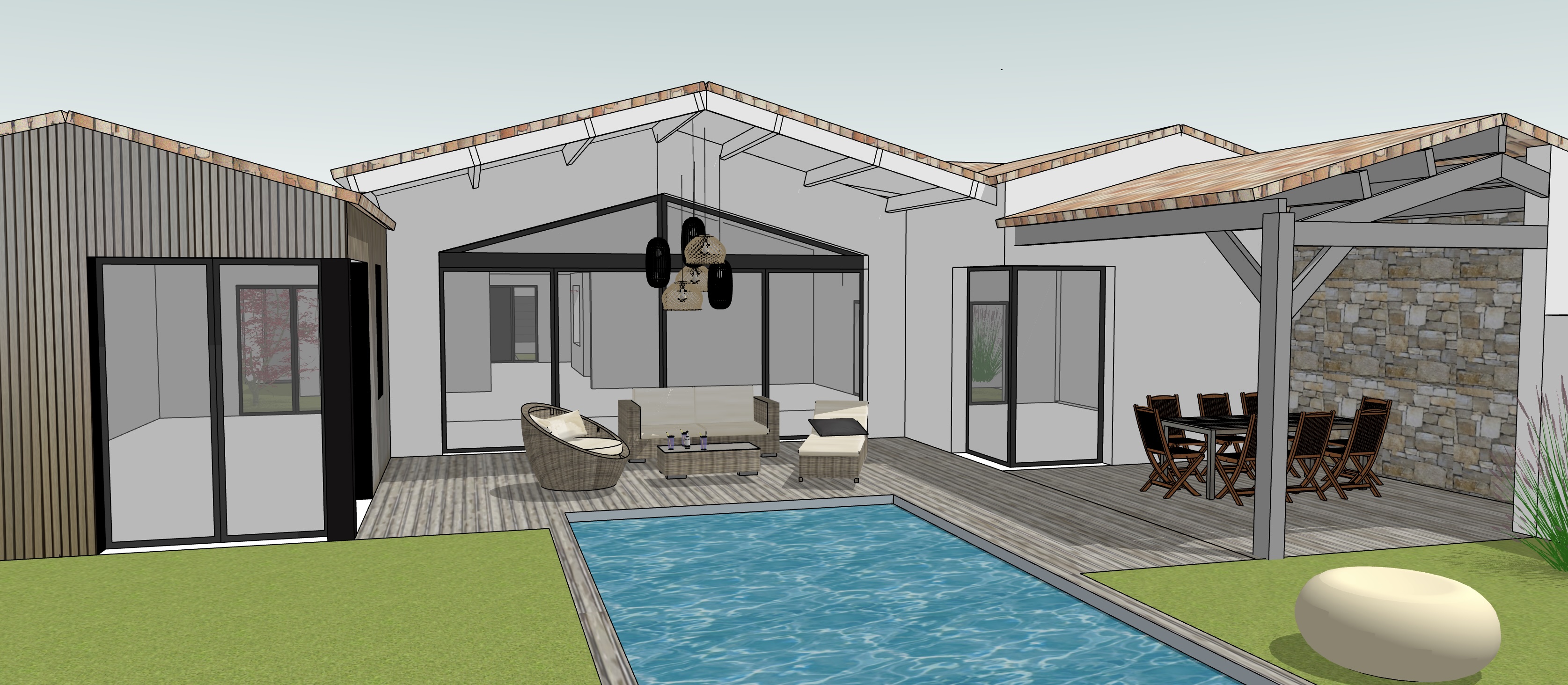 mati res identiques mais plus r alistes pas d ameublement a l int rieur charpente gris clair fen tres noires bardage joints debouts a gauche conserver les mati res sur le reste avec mobile de jardin pas de maisons autour