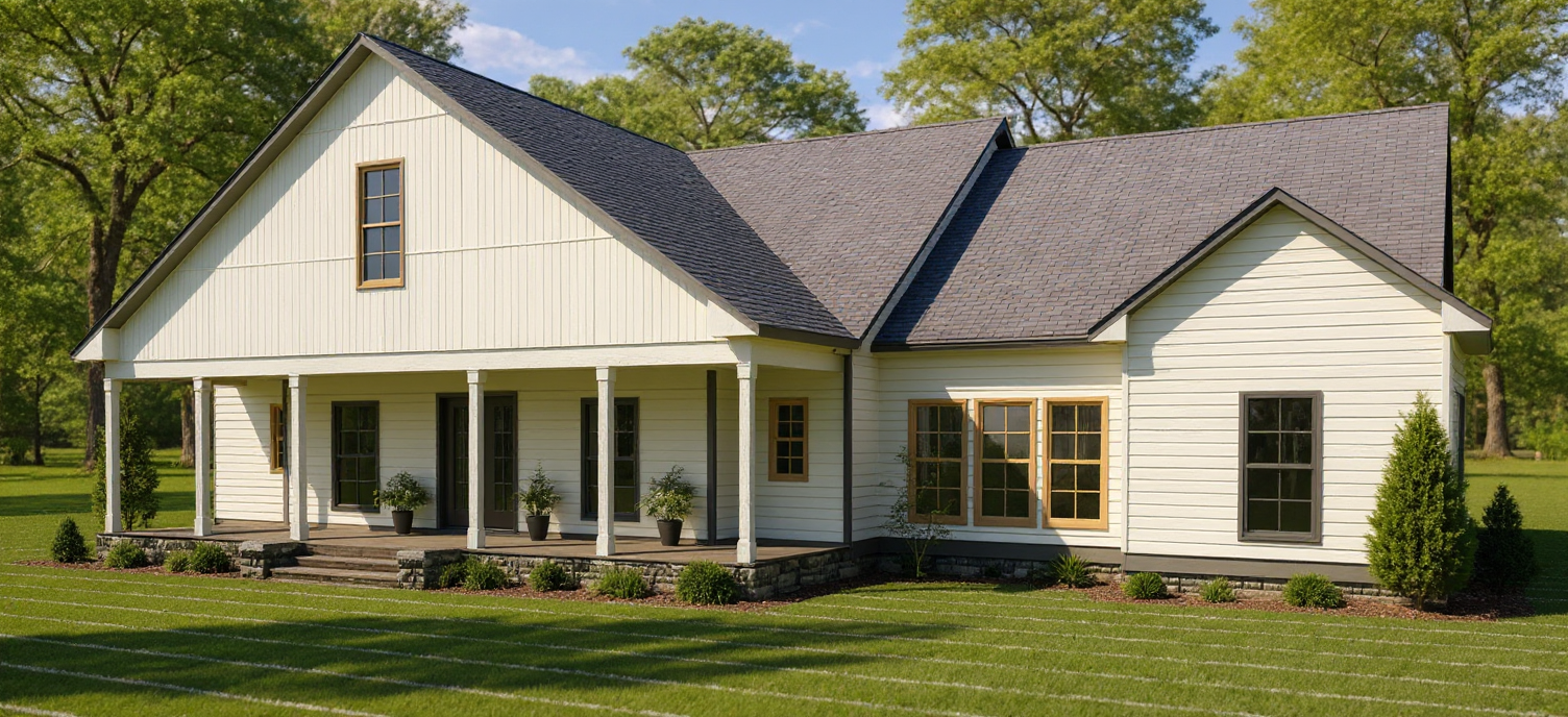 make the house white with black shingles and shutters light blue front 3 pane door light gray stone landscape around the house concrete sidewalk from front porch to concrete driveway keep the roof pitch and exterior of home the same as original rendering white windows and white garage door landscape the yard change the windows grid pattern on house windows to 2 over 2