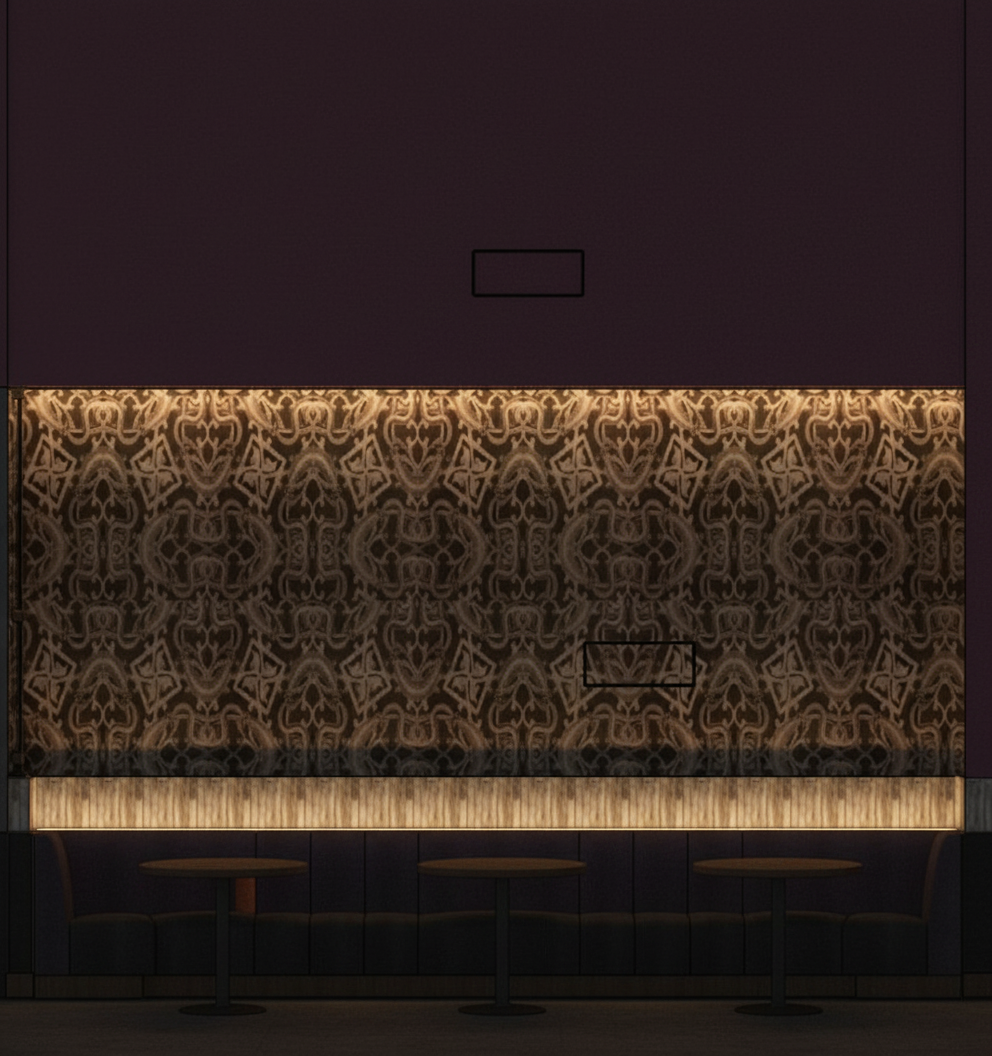 recreate this elevation of a restaurant booth alcove into a photorealistic elevation the atmosphere should be moody with a downlighting strip and shadowing the booth upholstery is glam gator in passion purple and the tile above the booths is komorebi brick in forest dew color the wallpaper above the tile should be maintained make photorealistic