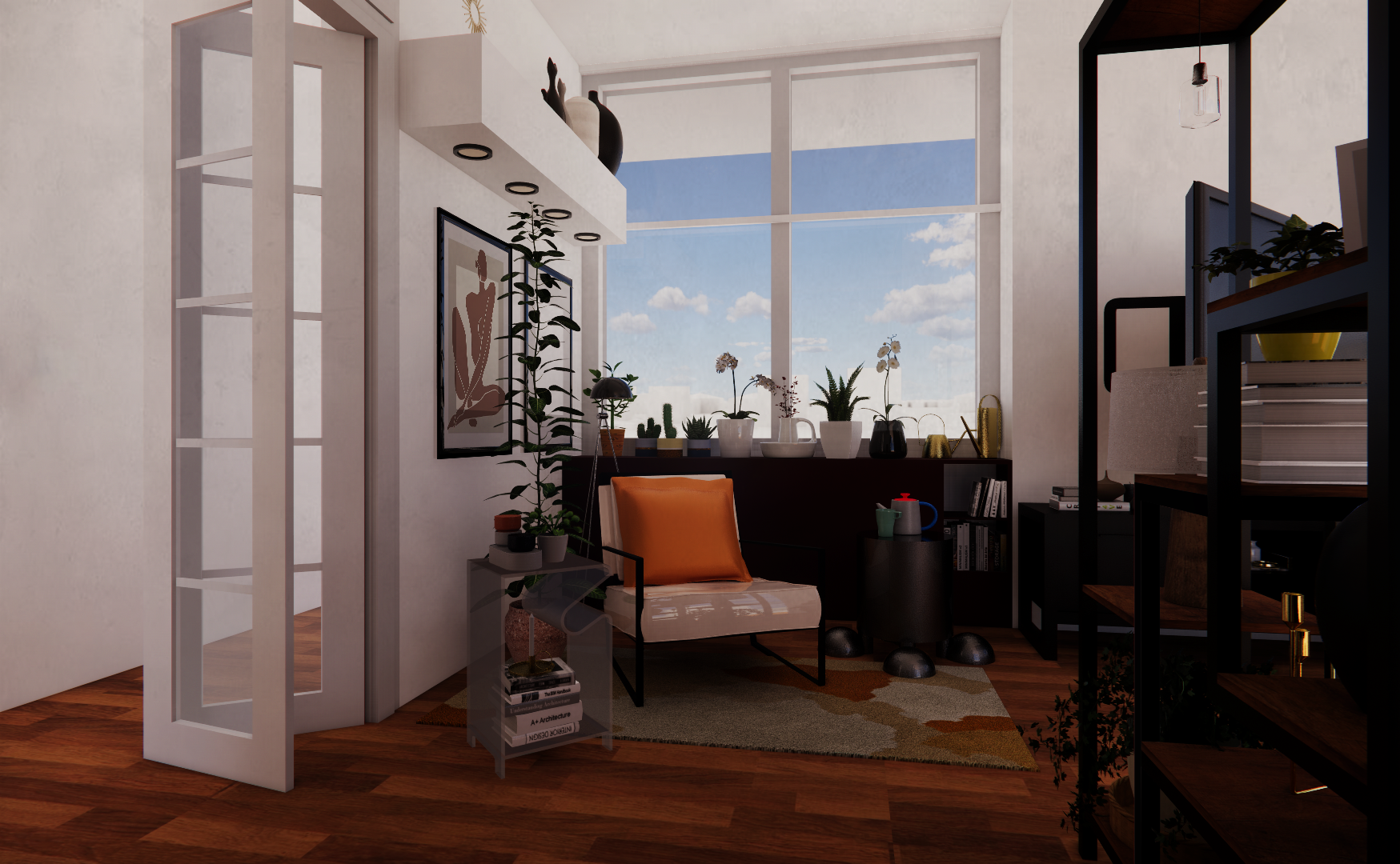 convert this floor plan into a realistic isometric 3d view of a living room show the space from an elevated angle with furniture walls and details visible use the same furniture as shows on the plan do not change the orientation of the floorplan
