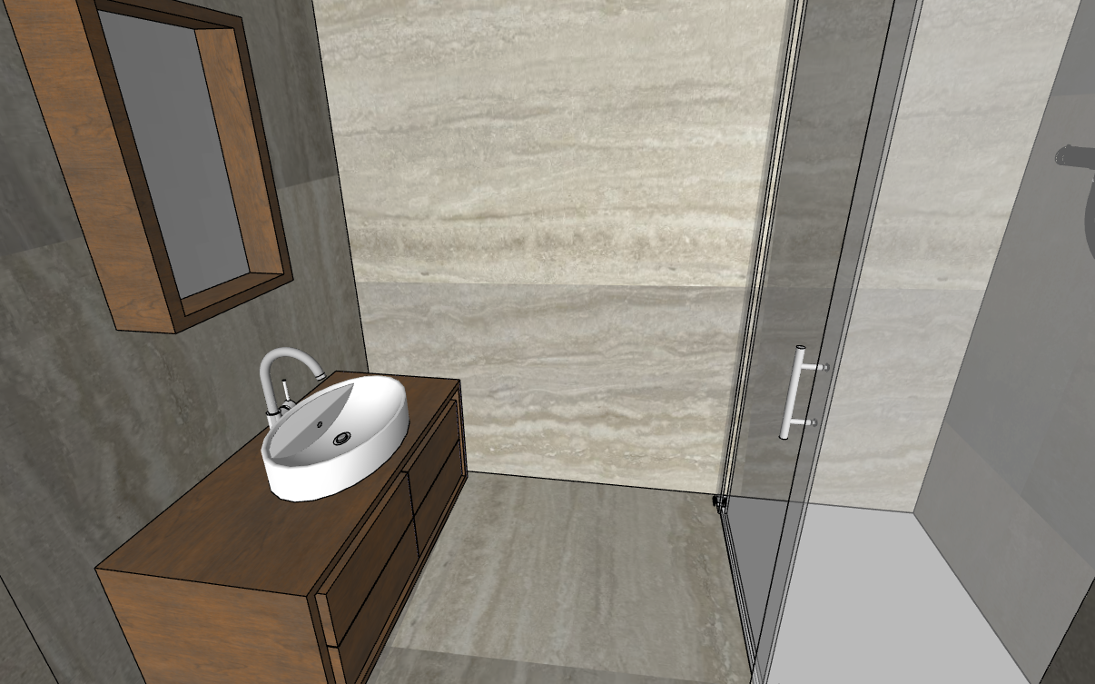 all the walls and floor are in light grey travertine