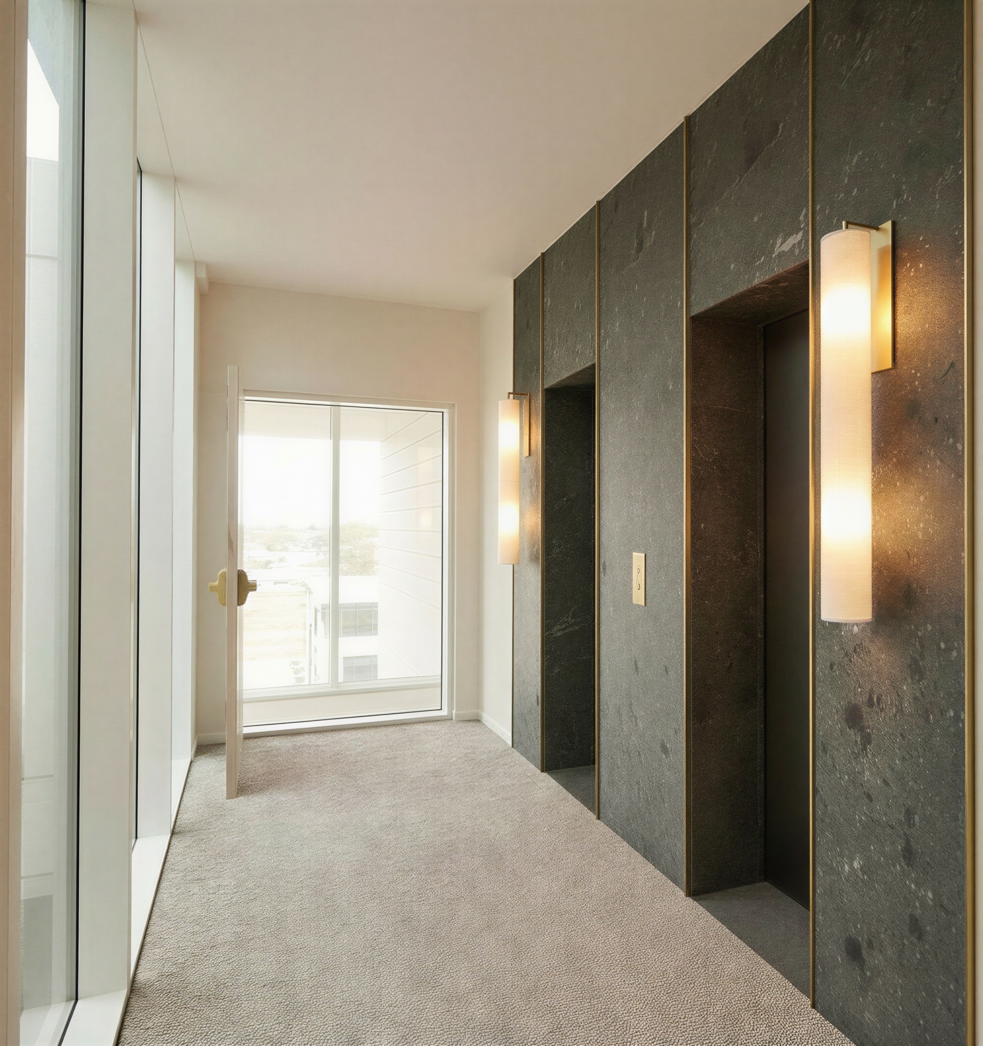 inserisci legno rovere sbiancato dietro le applique e nella fascia centrale dove ci sono i comandi dell ascensore