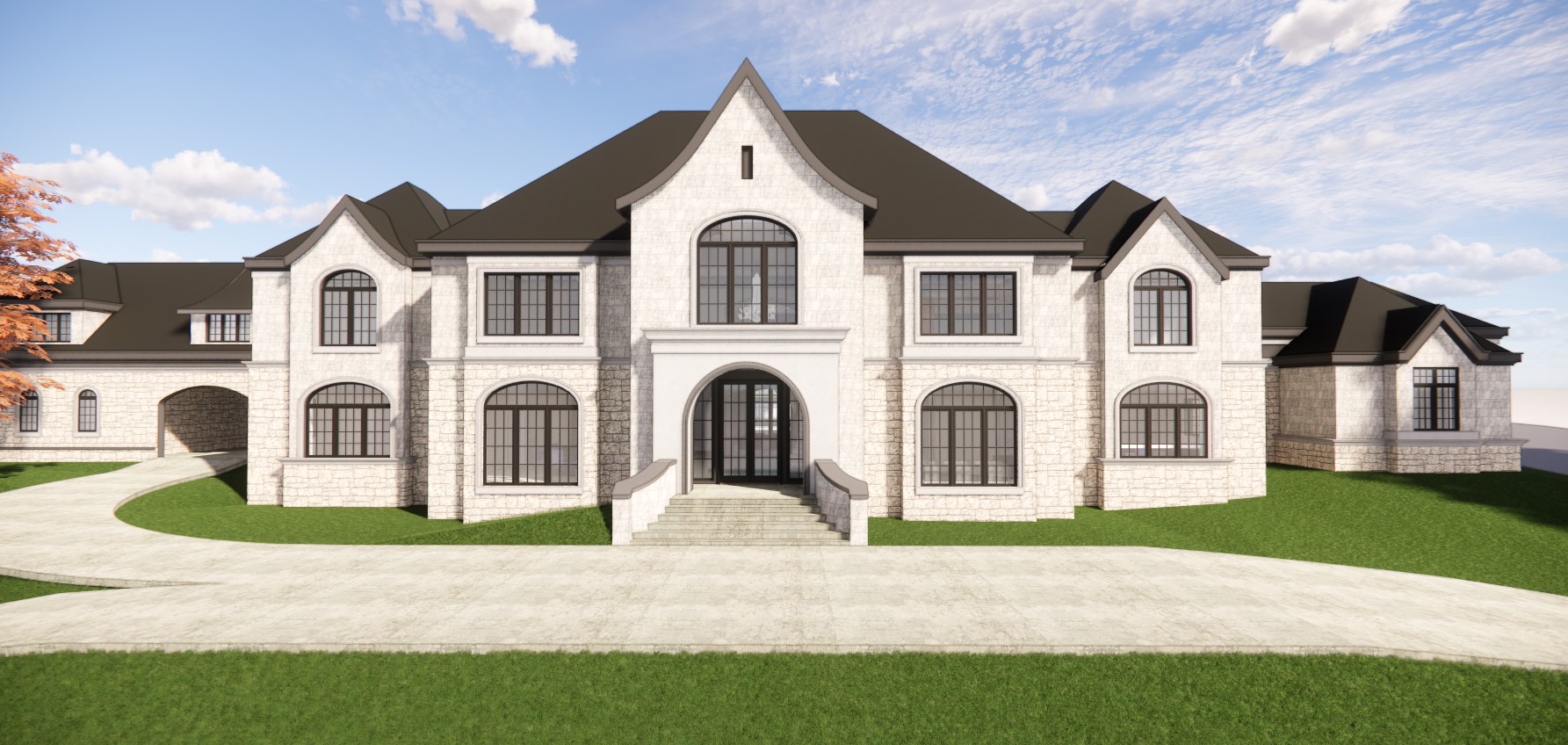 dark charcoal standing seam roof dark roof fascia light plaster trim dark window frames and mullions modern landscaping cobblestone driveway