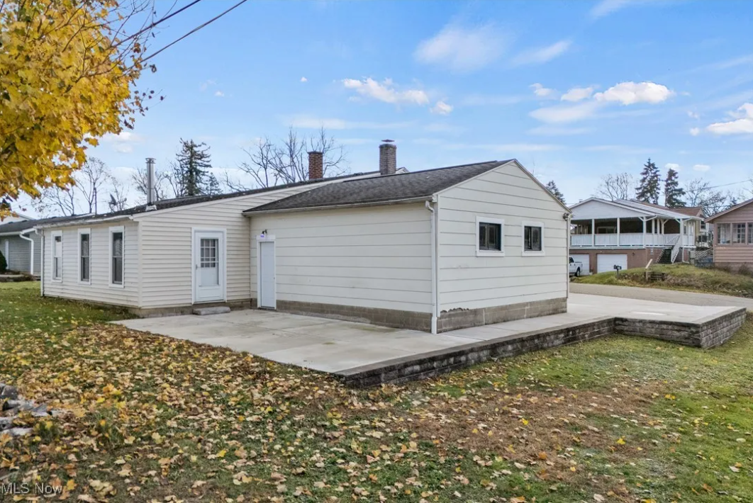 paint the vinyl siding blue refer to reference image and create landscape beds around the concrete patio add residential shrubs and perennials to the beds furnish the patio with patio furniture create a welcoming backyard scene
