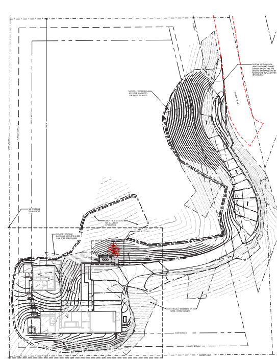 super accurate site plan render site is located in an aspen forest add color to the driveways and terraces keep the design the same but add trees shrubs shadows fire in the fire pit off the driveway parking area
