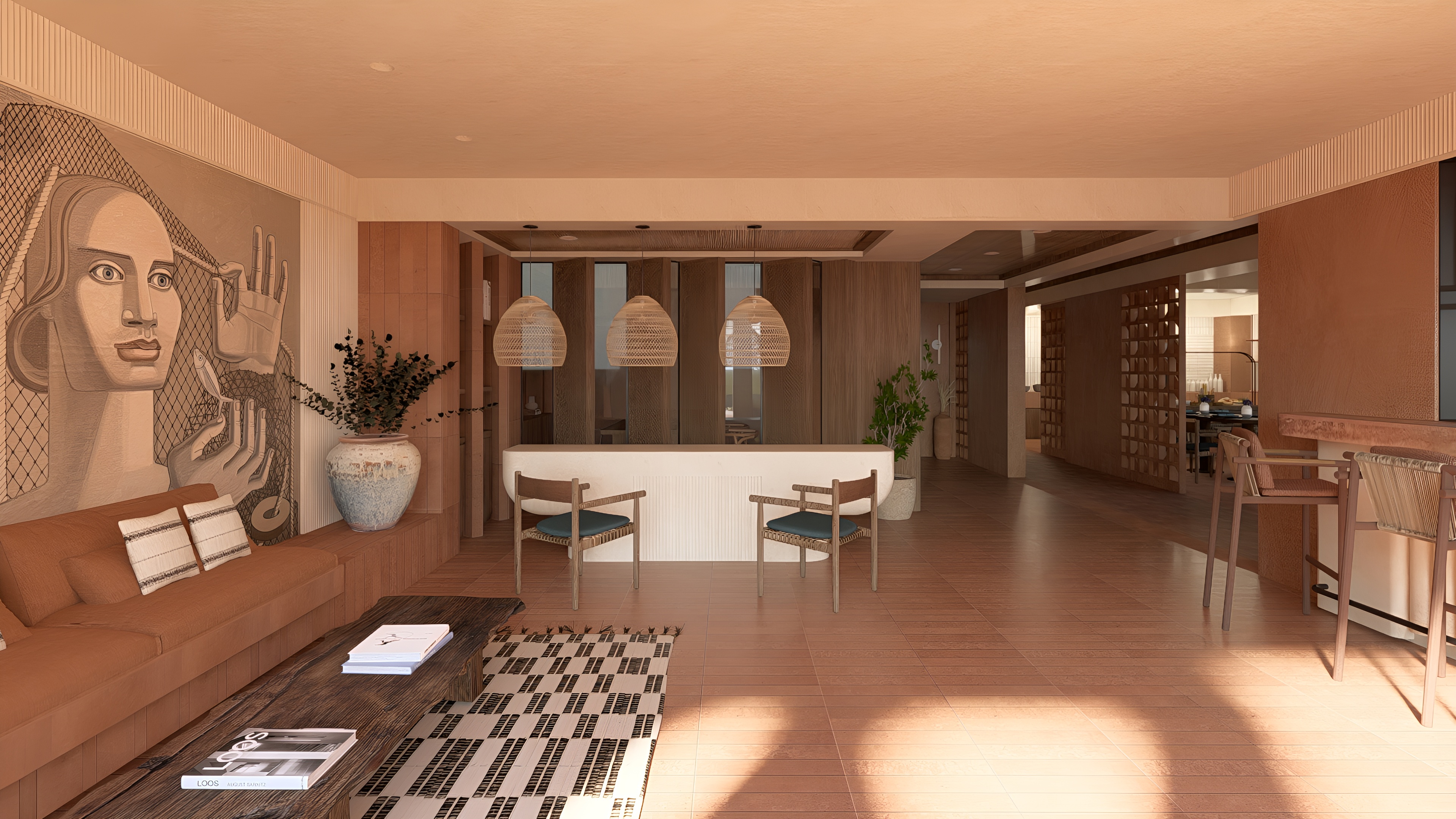 a hyper realistic hotel reception interior with terracotta tiles on the floor and terracotta wall colr the ceiling is beige the mural on the left wall has a beige background