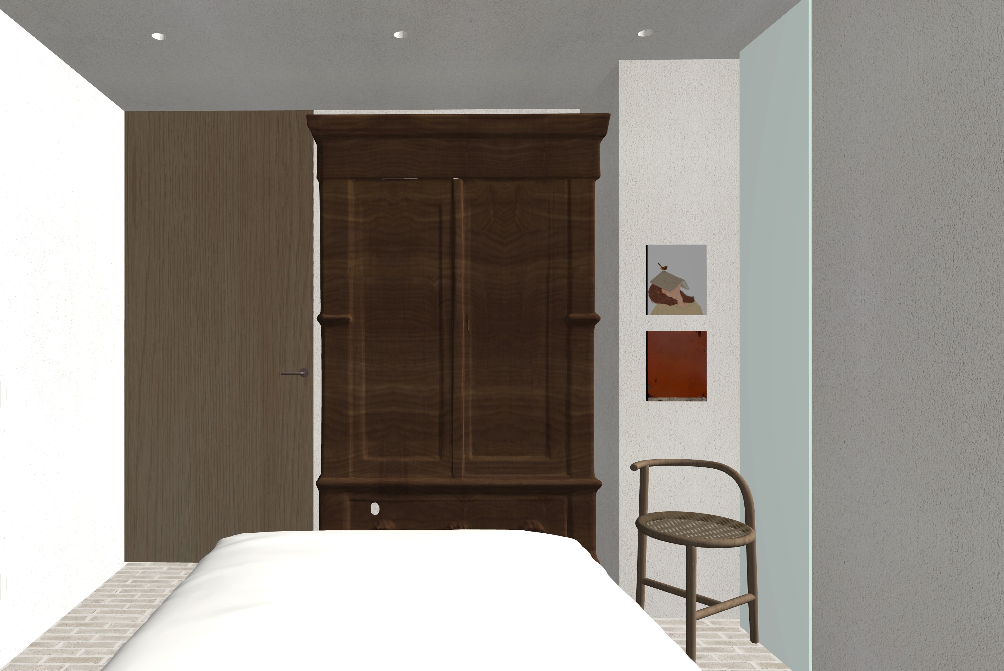 mantieni texture immagine fai entrare luce naturale da dietro il letto pavimento come texture immagine muro come intonaco esterno bianco accendi faretti a soffitto aggiungi due cuscini decorativi azzurro polvere aggiungi dei libri sulla sedia la piccola fascia azzurro chiaro a destra uno specchio a tutta altezza