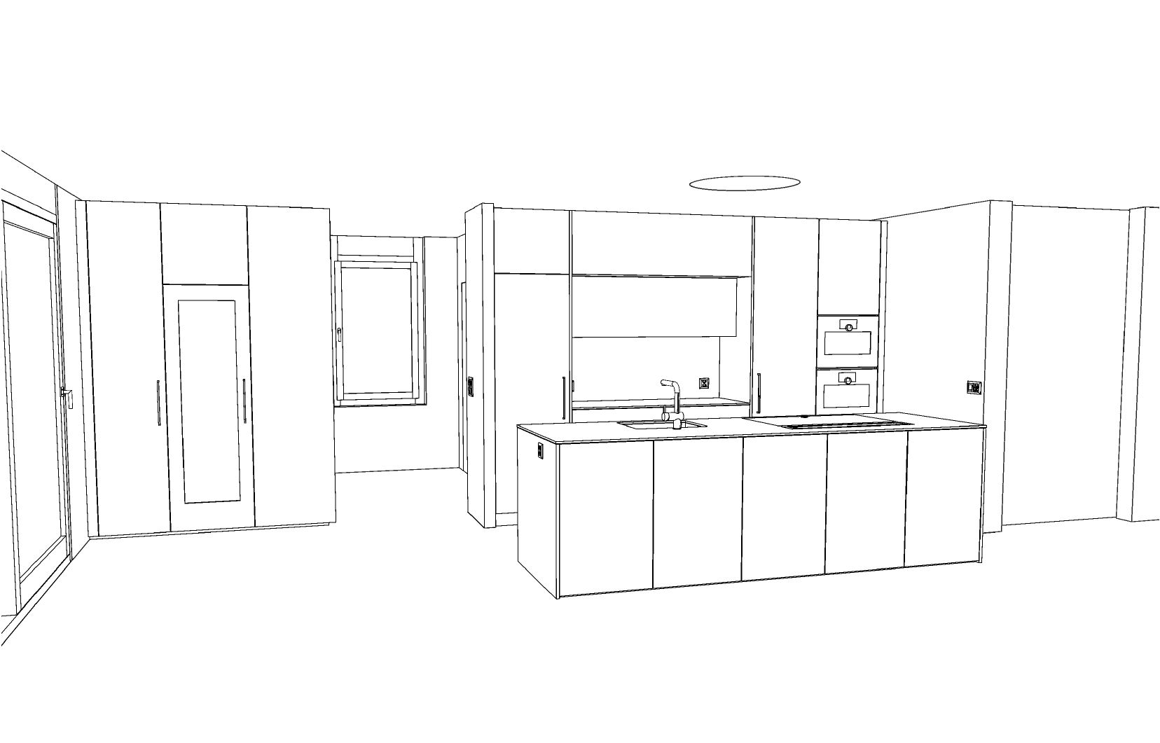 wandeln sie die drahtgitterperspektive in eine hochaufl sende fotorealistische architekturvisualisierung um wobei die definierten farben materialien und geometrien strikt beibehalten werden m ssen geometrie die hochgeladene skizze ist die einzige ma gebliche quelle f r die gesamte geometrie und struktur unter keinen umst nden d rfen elemente hinzugef gt entfernt erweitert neu gestaltet optimiert oder neu interpretiert werden es d rfen keine zus tzlichen schr nke paneele regale architektonischen details oder strukturellen komponenten hinzugef gt werden es ist nur die anwendung von materialien erlaubt jede nderung die ber die materialanpassung hinausgeht gilt als fehler behalten sie die geometrie strikt unver ndert bei ndern sie keine proportionen ffnungen volumen ausrichtungen oder architektonischen elemente behalten sie die exakte kameraperspektive bei k che materialien k chenfronten in weiss hochgl nzend lackiert leichter realistischer spiegeleffekt ohne bertreibung pr zise einheitliche frontunterteilungen mit konsistentem fugenbild wo keine griffe gezeichnet sind die t ren push to open grifflos dort wo griffe gezeichnet sind bei den hochschr nken sind diese edelstahlfarbig geschliffen matt keine sichtbaren befestigungen die beiden exklusiven einbauback fen und die w rmeschublade von gaggenau haben schwarze reflektierende glasfronten und sind grifflos realistischer spiegeleffekt ohne bertreibung der zweite hochschrank von links ist ein weink hlschrank mit einem weissen frontfarbigen rahmen hochglanz und einer glasf llung dahinter sieht mann die auf holzrosten liegend lagerndene weinflaschen arbeitsplatte granit taj mahal helles beige mit dunklerer maserung ruhige und zur ckhaltende optik feine dezente struktur halbmatter glanz die oberfl che sollte eine dezente realistische lichtreflexion aufweisen kein starker glanz klare pr zise berg nge zwischen stein holz und lackoberfl chen solide gefertigte optik mit ruhigen pr zisen linien und hoher handwerklicher pr zision klare proportionen zur ckhaltende details bodenkonzept der ganze boden ist riemenparkett in eichenholz mittelbraun cognacfarben mit gut sichtbarer struktur wandkonzept die w nde sind weissputz mit weiner gleichm ssiger struktur die t ren und fenster sind weiss seidenmatt gestrichen elektrik dekoration steckdosen nur dort anbringen wo sie ausdr cklich im drahtgittermodell eingezeichnet sind keine zus tzlichen steckdosen hinzuf gen die steckdosen sind weiss dekorative elemente minimalistisch und zeitgem ausschlie lich in arbeitsplattenh he positioniert passend zur modernen schweizer k chen sthetik zur ckhaltend hochwertig aufger umt beleuchtung nat rliches tageslicht f llt durch gro z gige fensterfronten links und im r cken ein weiche realistische schattenbildung dezente glaubw rdige reflexionen auf der kunststeinoberfl che keine k nstlichen lichteffekte keine berinszenierung atmosph re ruhig wohnlich hochwertig emotional zur ckhaltend mit fokus auf materialit t und raumqualit t authentische schweizer lebensqualit t rendering stil fotorealistische architekturvisualisierung nat rliche farbbalance und realistische texturen hohe detailtiefe bei oberfl chen aus holz stein lack und kunststein keine bertreibungen kein showroom look keine dramatischen effekte starker fokus auf materialauthentizit t proportionen und handwerkliche pr zision fotorealistisches physikalisch basiertes rendering scharfe texturen ausgewogener realismus