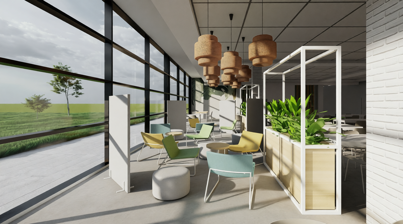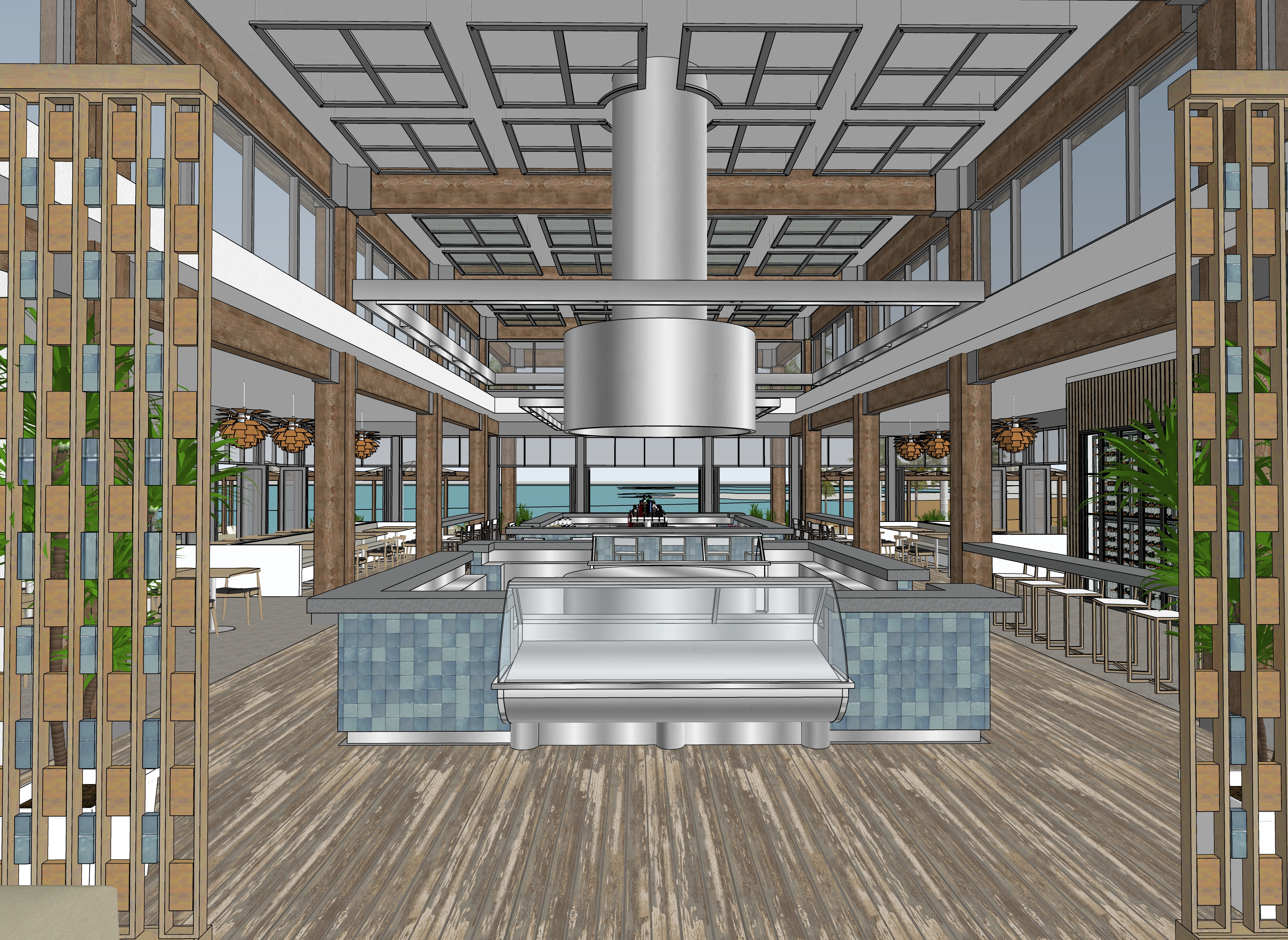 evening view location is a beach resort on the red sea egypt the views beyond the building are of the horizon over the water with setting sun lighting add low level lighting effects to the inside of the restaurant add people sitting the restaurant at the tables and stools add drinks and food to the tables and bars add seafood on a bed of ice in the display cooler add a chef cooking at the circular grill light up the wine bottles in the glass display cases the columns and beams are made of heavy wood timber add up lighting the the ceiling add people sitting at the bar on the stools by the wine display cases keep the perspective view in the source image add three sailboats on the sea near the horizon keep the decorative screens in the foreground at the left and right side of the original view keep the lighting from the last rendering add a wine sommelier by the wine display cases make the square suspended lighting over the bars stainless steel material add a man and a woman looking into the display case on the right side add a waiter carry a tray of seafood entrees on the left side of the view add some steam rising from the grill where the chef is cooking the bar counter tops are dark granite in a matte finish