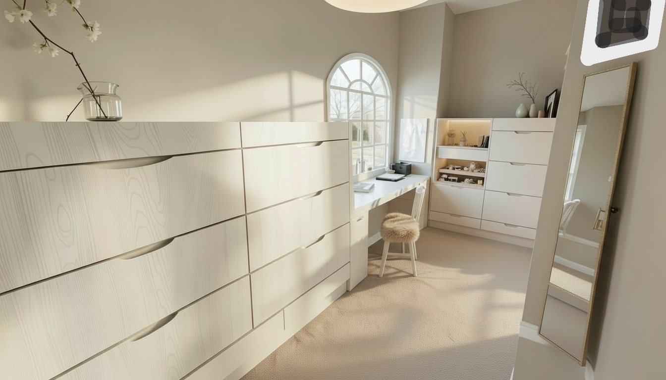 create a realistic closet rendering with a frosted transom window above a leaning large full length mirror add a rug on the floor near the mirror