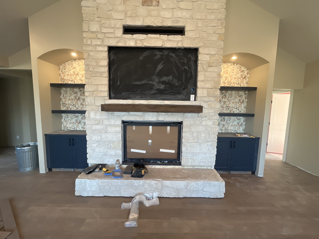 do not change the cabinets in any way preserve the exact cabinet colors materials finishes dimensions door and drawer styles hardware spacing alignment and all geometry exactly as shown do not alter the countertop shape backsplash appliances flooring lighting fixtures or wall structure only remove the construction materials clutter and mess from the scene clean the room and make it look finished and staged add a few simple tasteful home accessories appropriate for the style of the space but do not add or remove any furniture windows or architectural elements maintain the original lighting direction and realism enhance clarity and polish the photo while keeping the cabinetry and room design completely unchanged do not alter the lighting to keep the cabinet colors as they are in the image stage for a great room put a simple screen saver on the tv make the fireplace have a soft glow add toe kick to the cabinets