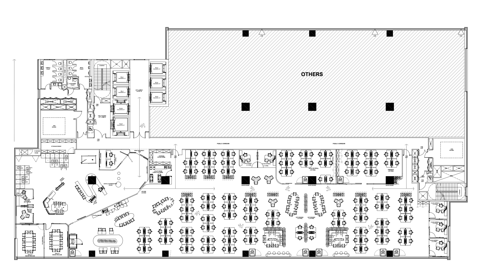 convert this floor plan into a realistic isometric 3d view of a office show the space from an elevated angle with furniture walls and details visible front of house to make it more professional overall look to reduce timber look and feel soft finishing to include yellow blue use the same furniture as shows on the plan do not change the orientation of the floorplan