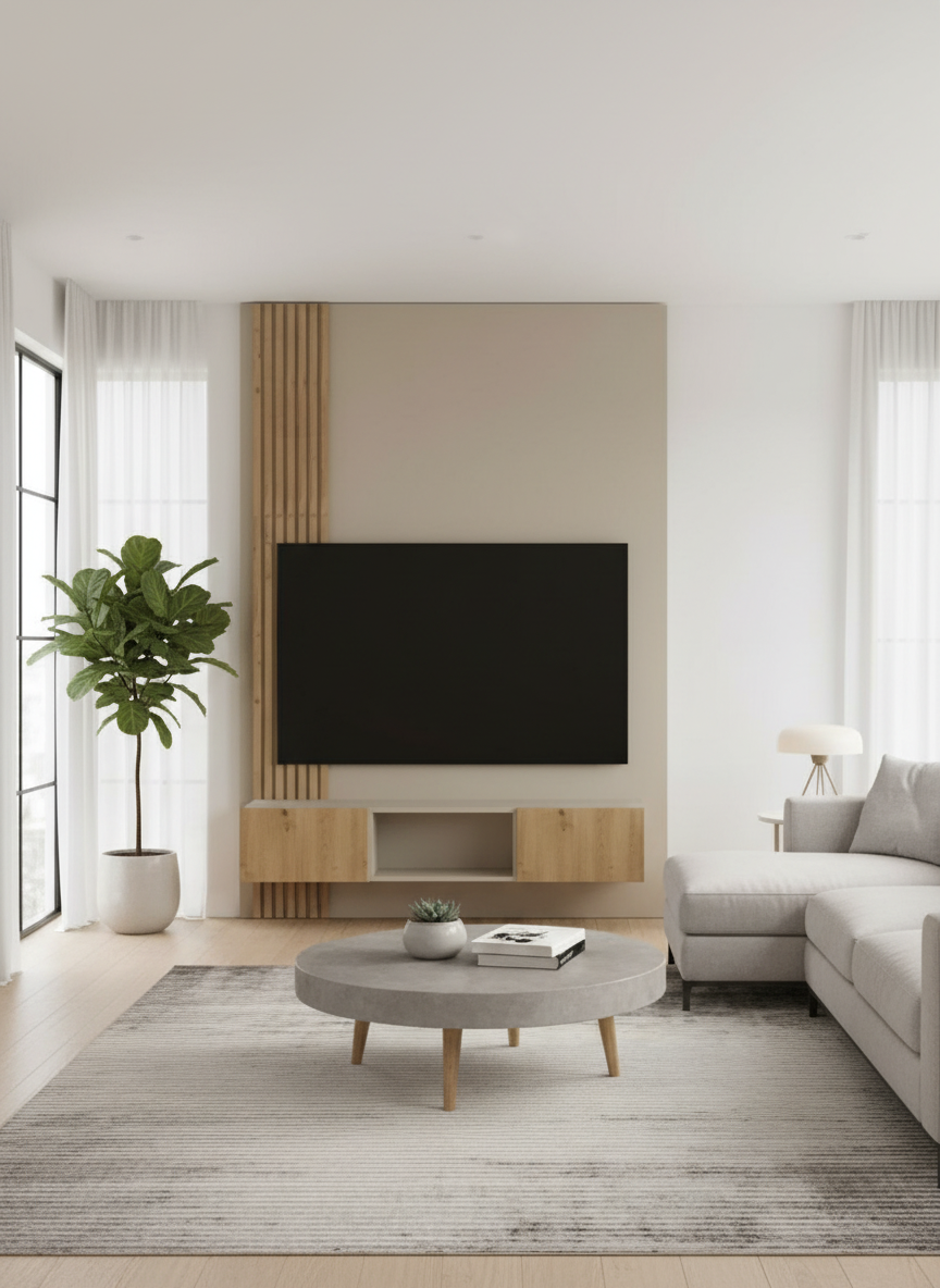 dont make changes to the model realistic architectural interior render of a modern minimalist kitchen with warm neutral tones l shaped kitchen layout with light wood grain cabinetry and black trim accents tall ceiling cabinets extending upward with integrated vertical wooden slat panel detail upper cabinets with framed glass panels and soft interior reflections white marble countertop and backsplash with subtle grey veining running along the wall central kitchen island with thick marble countertop and light wood paneling including an inset open shelf facing the seating area three modern black bar stools placed along the island built in stainless steel oven and microwave integrated into the tall cabinet unit black water dispenser unit embedded within the vertical slat panel large matte black refrigerator positioned on the right side of the kitchen minimalist range hood above the cooking area two interior doors with black frames and frosted glass panels visible on the left wall clean tiled flooring and simple grey walls scandinavian japanese inspired modern interior design soft natural daylight illumination subtle ambient shadows global illumination realistic material textures soft reflections on marble surfaces ultra realistic architectural visualization remove the cooking stove on top of the kitchen countertop and fill the glass paneled cabinet with items