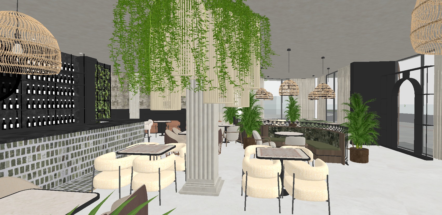 make a high quality render photo don t change anything the ambient light should be natural the textures should look real and high quality also the greenery around the lights in the middle that are made of thin metal should be real and look real so don t change anything in the design or order just make the render look high quality and real and the lighting of the lights look real the restaurant should be luxurious