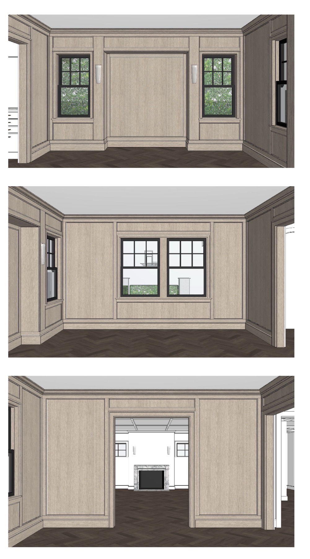 add a large square modern art canvas to the niche place a round marble table with 6 wooden dining chairs around it and a glass pendant over add roman shades to windows in sheer white