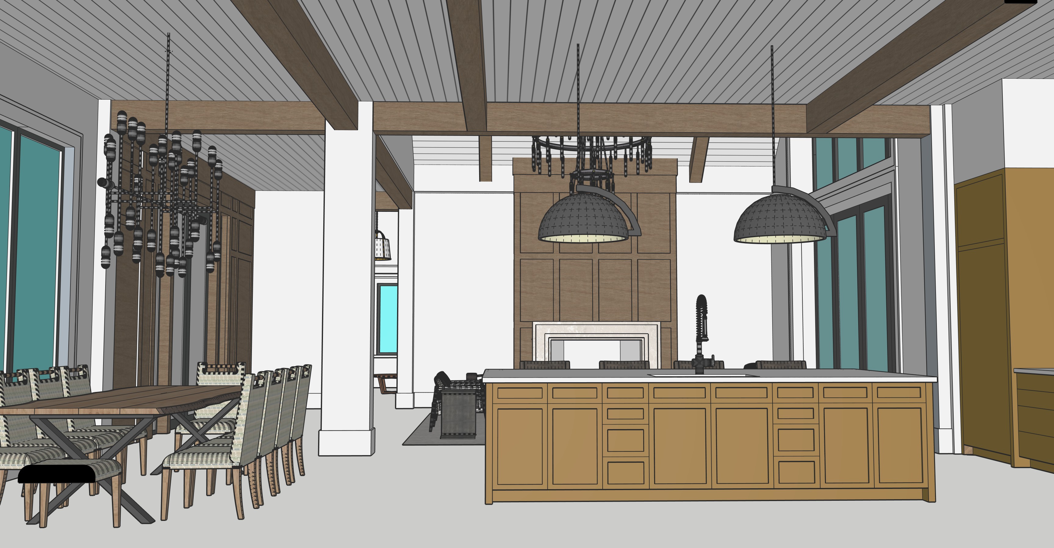 light colored wood floors and timber beams painted t g wood ceiling on flat ceiling great lighting panelized wall at fireplace with stone surround walls on either side of fireplace window in far distance on the left in a study
