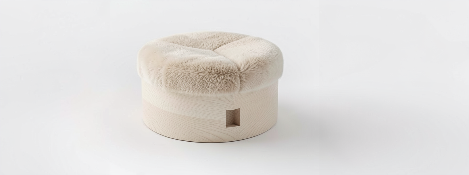 make upholstered top a light beige fur make the wood base a medium tone white oak in a matte finish show dovetail joinery with no recess on the base