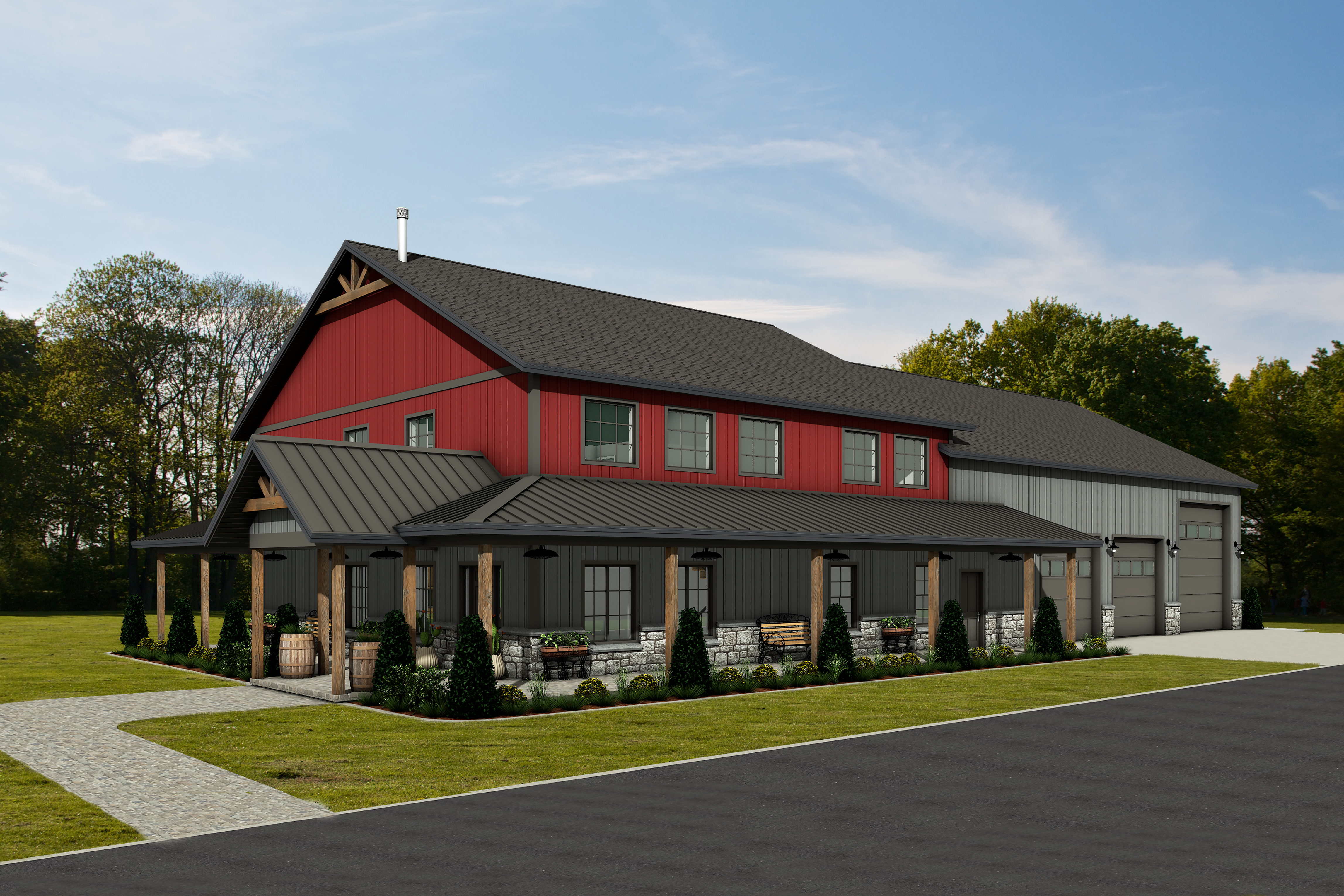 add landscaping and small bushes and shrubs around porch and building make it winter season it is early morning there are a few lights on in the house