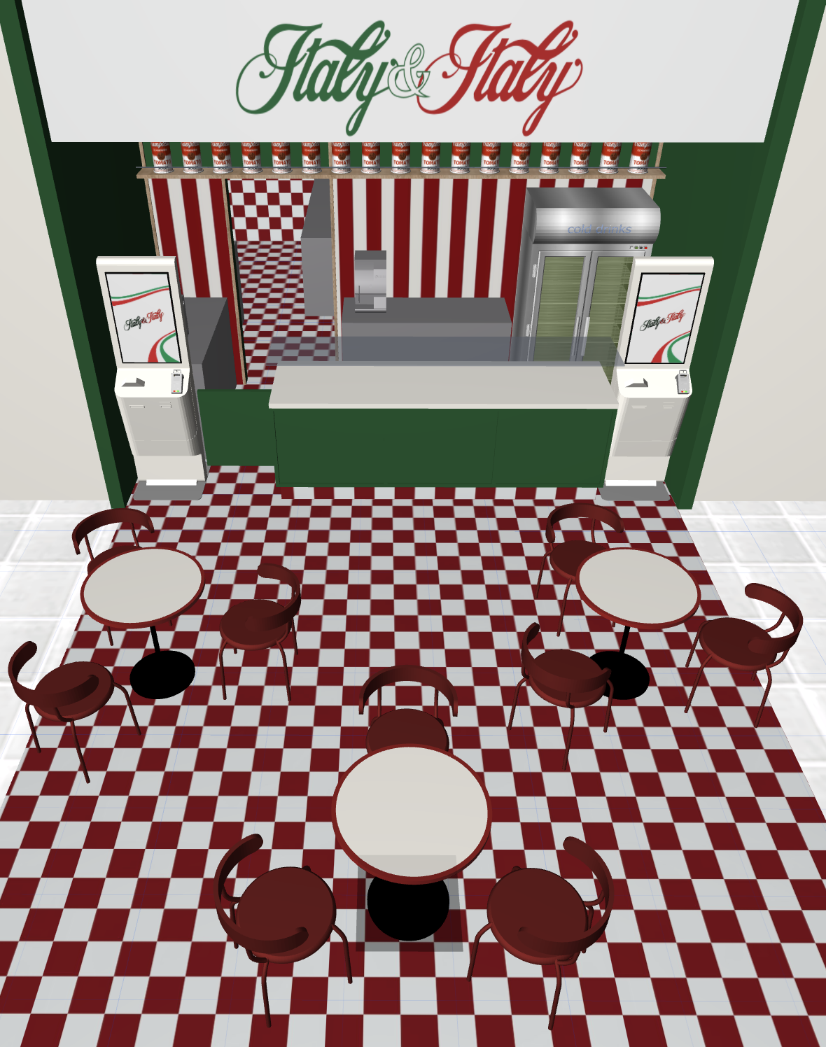 siamo in un centro commerciale di giorno aggiungi luce soffusa e calda sul bancone metti street food i banconi dietro quello frontale sono in acciaio aggiungi oggettistica da bar e riempi il frigorifero di bibite le sedie sono rosse