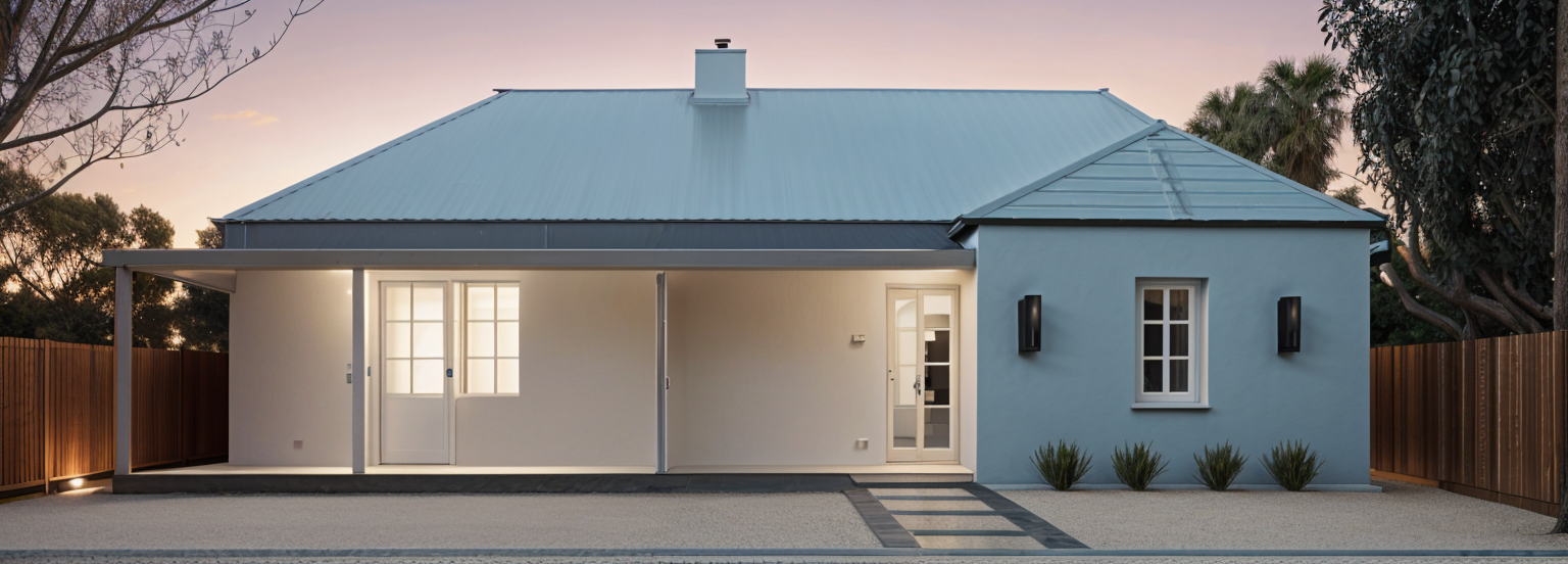 classical exterior shot in an australian rural setting at sunset with a lush green garden architecture