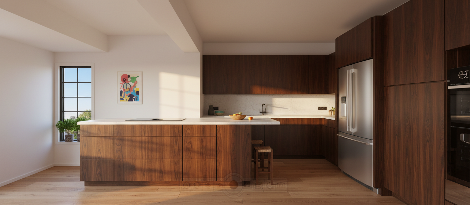 do no change any details other than adding chairs at the island ad breakfast table and chairs on the room in the back do not add anything to the island structure put lemon fruit bown on the island put only 2 chairs at the island and remove the supporting leg on the left side of the island