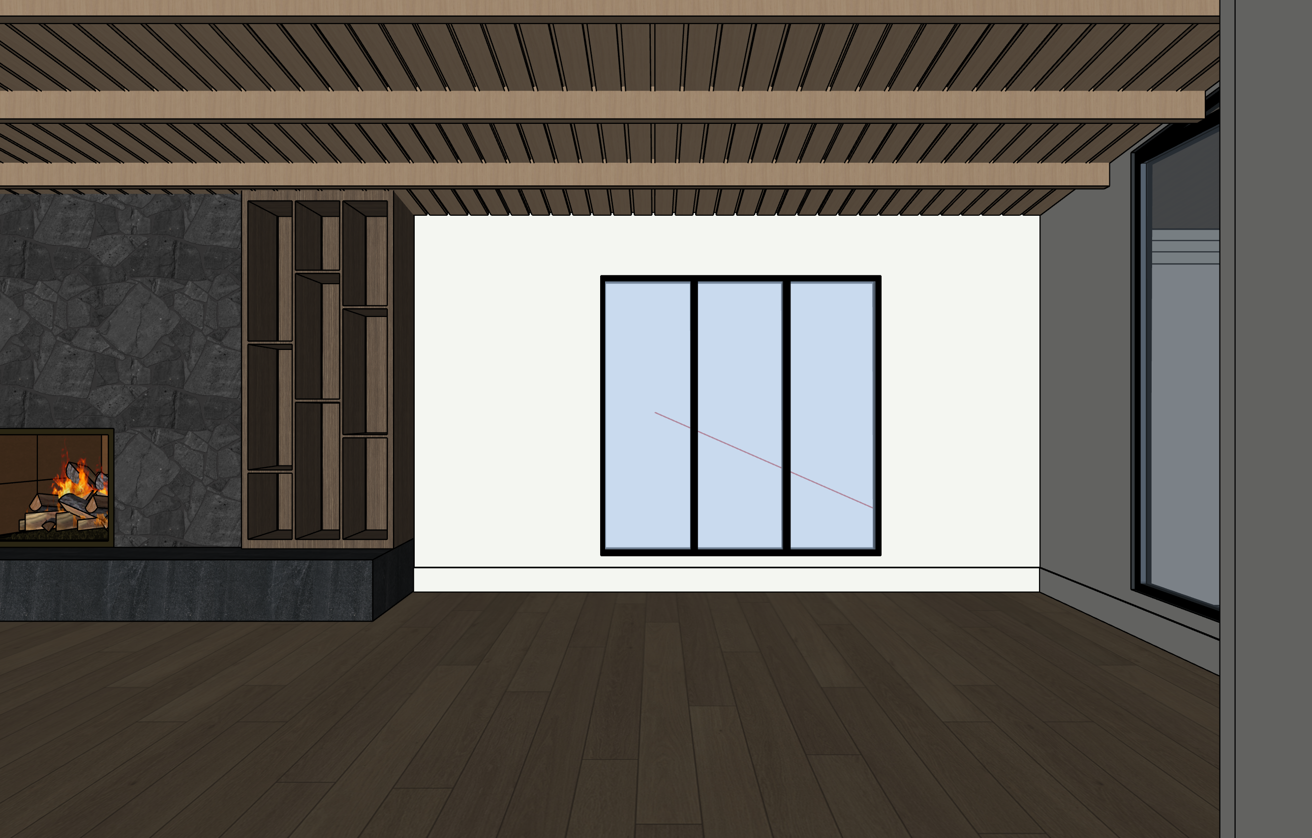 ultra photorealistic interior photograph of a dining room finishes include light oak wood plank floors and large windows that show a view of the mountains in the distance include two chandeliers over a modern dark wood dining room table that resemble tree branches with a dim glow the fireplace facade should include charcoal grey natural stone mosaic the built in cabinets to the right of the fireplace should have vertical led lights on the back left side of each cubby maintain the exact architecture layout and finishes from the original render the space features warm neutral tones materials should appear highly realistic lighting should feel daytime and cinematic shot as professional interior architecture photography with a full frame camera 24mm lens shallow but natural depth of field extremely high dynamic range crisp focus subtle lens imperfections and natural exposure style similar to high end architectural photography seen in a design magazine of luxury mountain homes in jackson hole or aspen ultra detailed photorealistic materials ray traced lighting global illumination cinematic composition natural color grading realistic textures professional interior photography do not change layout no redesign no extra windows no people no clutter no surreal lighting no warped geometry