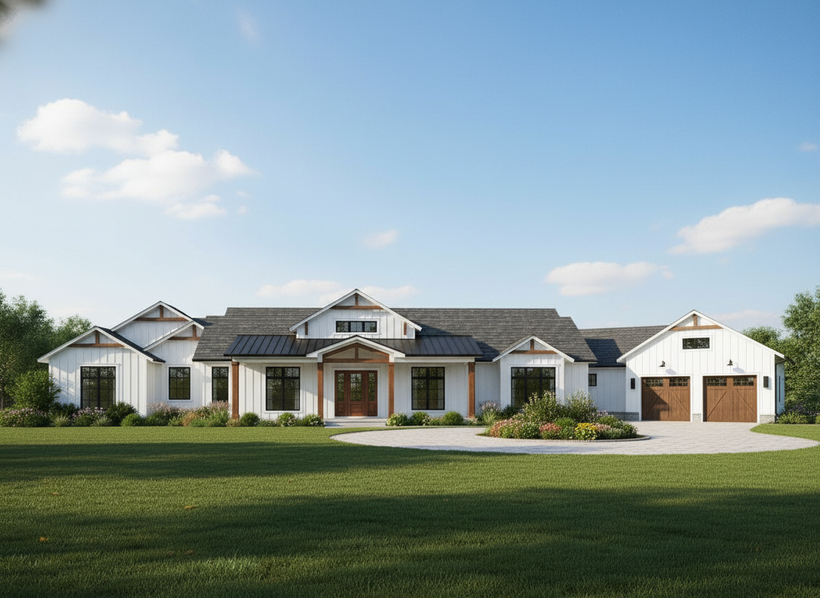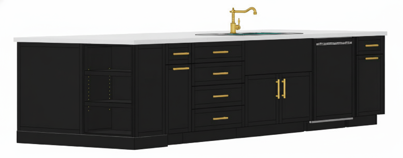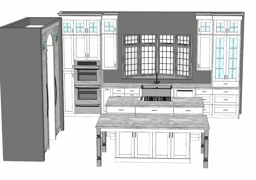 dark stained white oak cabinets on the perimeter 2 painted white islands black hardware make it look realistic