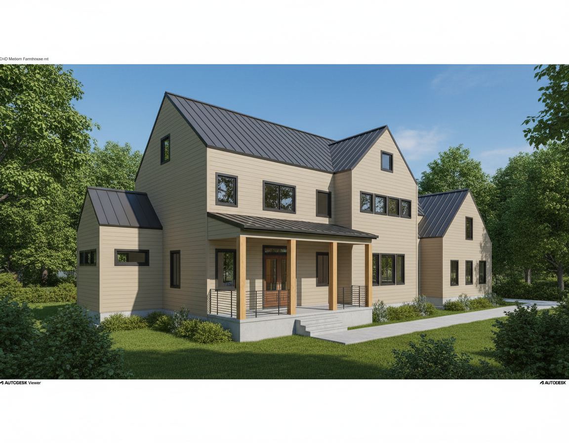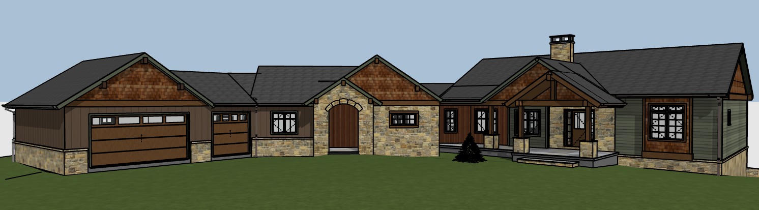 make photo realistic add driveway front walk landscaping with river rock and low mountains in background move sun to front of house late afternoon asphalt shingle roof gable fascia trim is green except for at front timbers siding on right side is also green