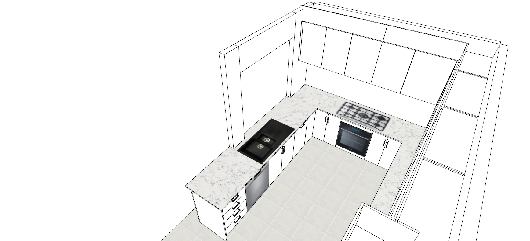flat white panel doors no shaker style or profile put light oak timber floorboards down just leave an open room behind the sink
