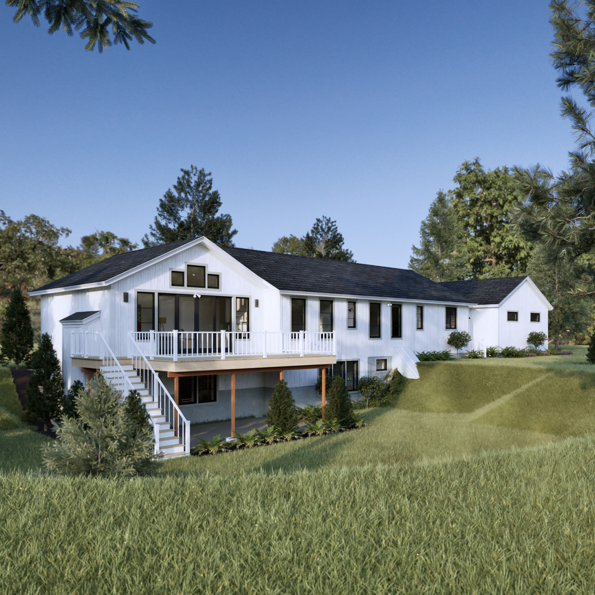 the house is surrounded by a lot of trees small bushes and flowers in the garden