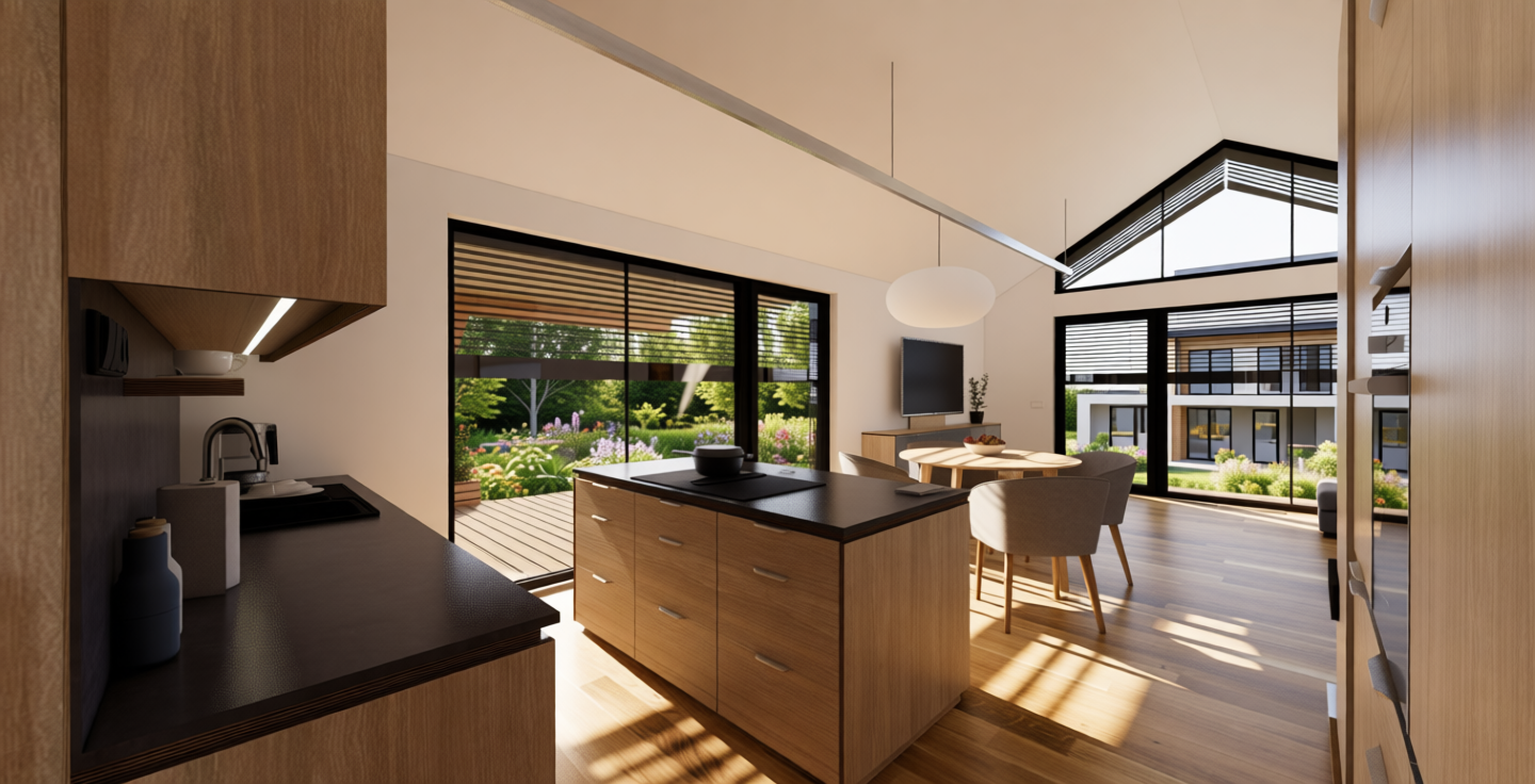add more realistic materials that match the photo exactly landscaping vegetation and place building within a suburban rural environment with light vegetation throughout the distance