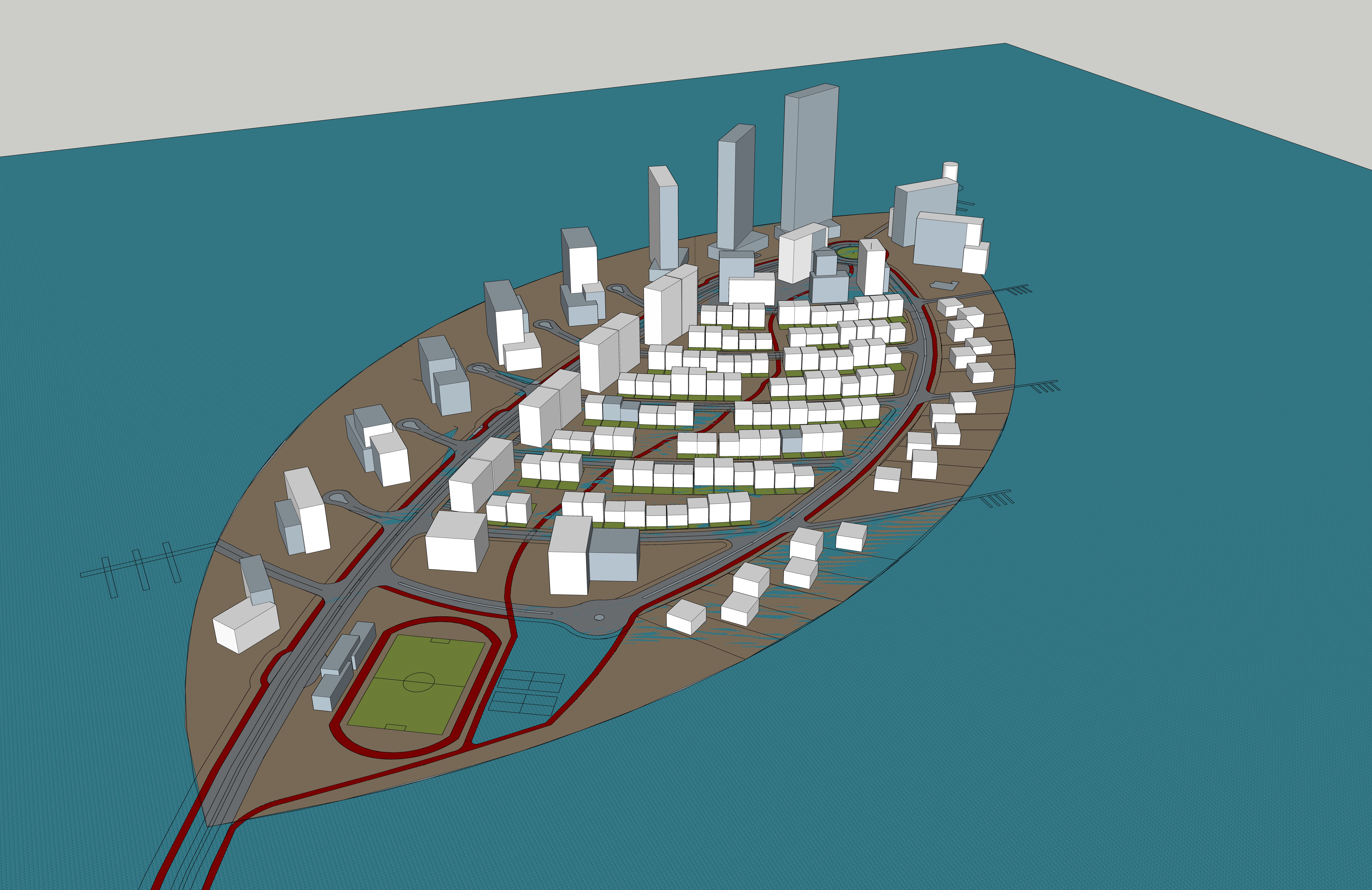 a modern tropical island city with housing sport hotels and retail add street furniture detail to buildings and people architecture
