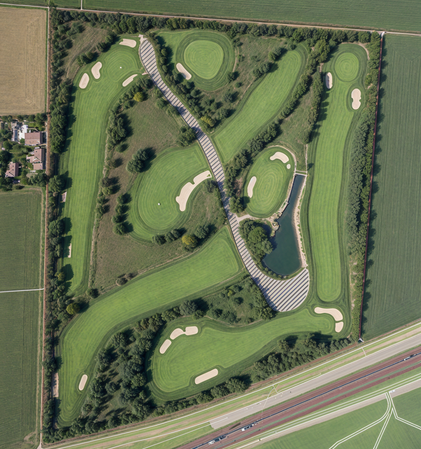 modern commercial building with large glass windows reflecting a clear blue sky brick facade with a warm reddish brown hue a split face light gray block base and stone accents in light gray the paved parking area is a sleek dark gray with subtle white lines surroundings include lush green grass creating a serene and inviting atmosphere bright and dynamic lighting with a soft shadow emphasizing the building s architecture daytime setting