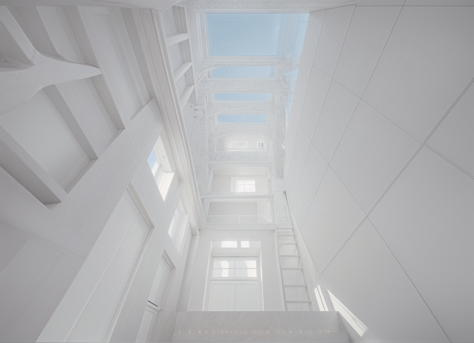 render a modern bathroom interior with elegant minimalistic style the walls and ceiling are covered in light oak wood panels with a warm tone creating a cozy and inviting atmosphere the floor is a pale beige natural stone to complement the wood include a sleek white freestanding bathtub with brushed bronze brass fixtures add two rectangular white vessel sinks on a beige natural stone vanity also with brushed bronze fixtures a large horizontal mirror is mounted above the sinks on the right there s a window with a dark bronze frame allowing soft natural light to illuminate the space the atmosphere is serene and spa like with a soothing warm ambiance architecture