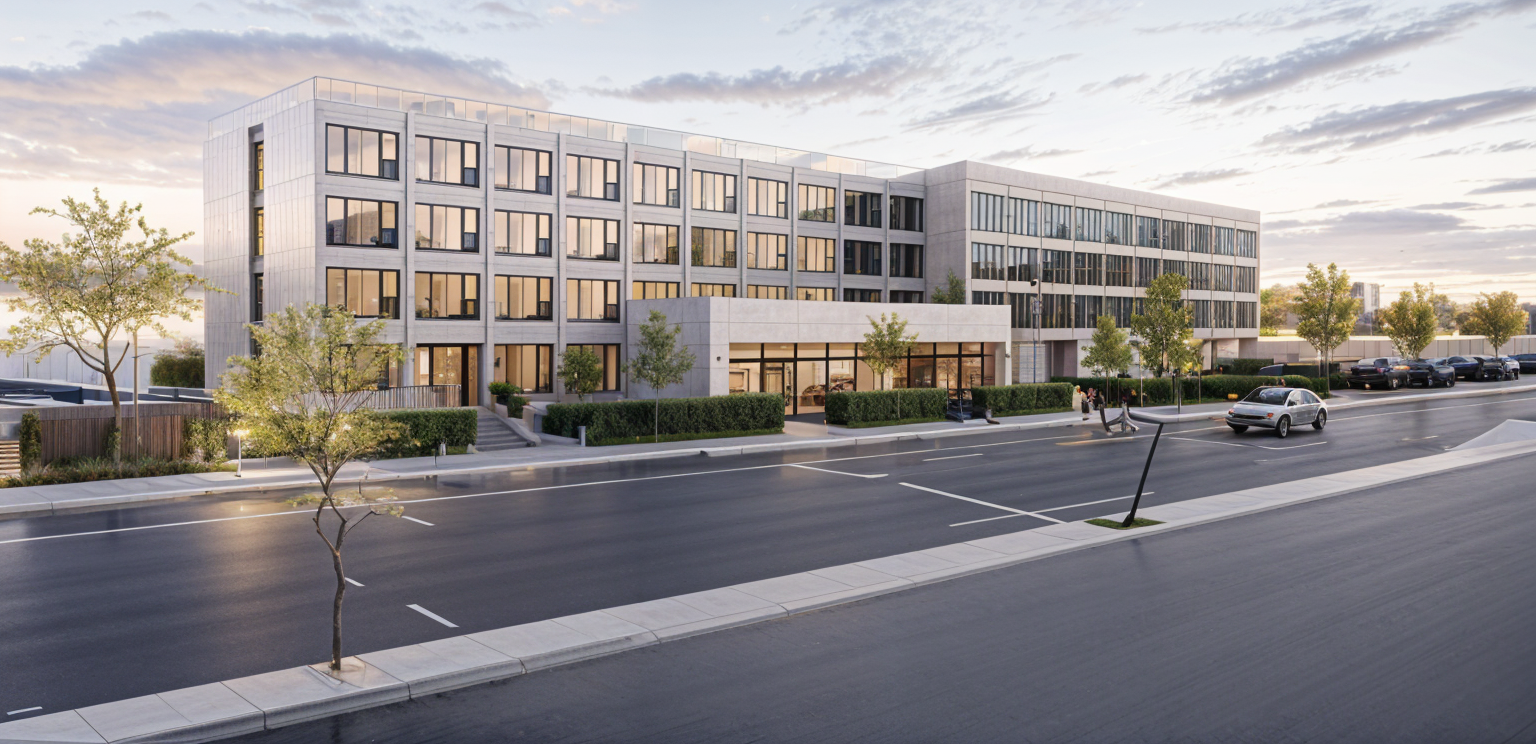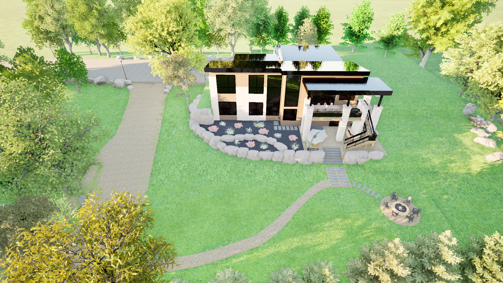 a manicured lawn layered flower beds low maintenance shrubs native plants stone pathway leading to the entrance