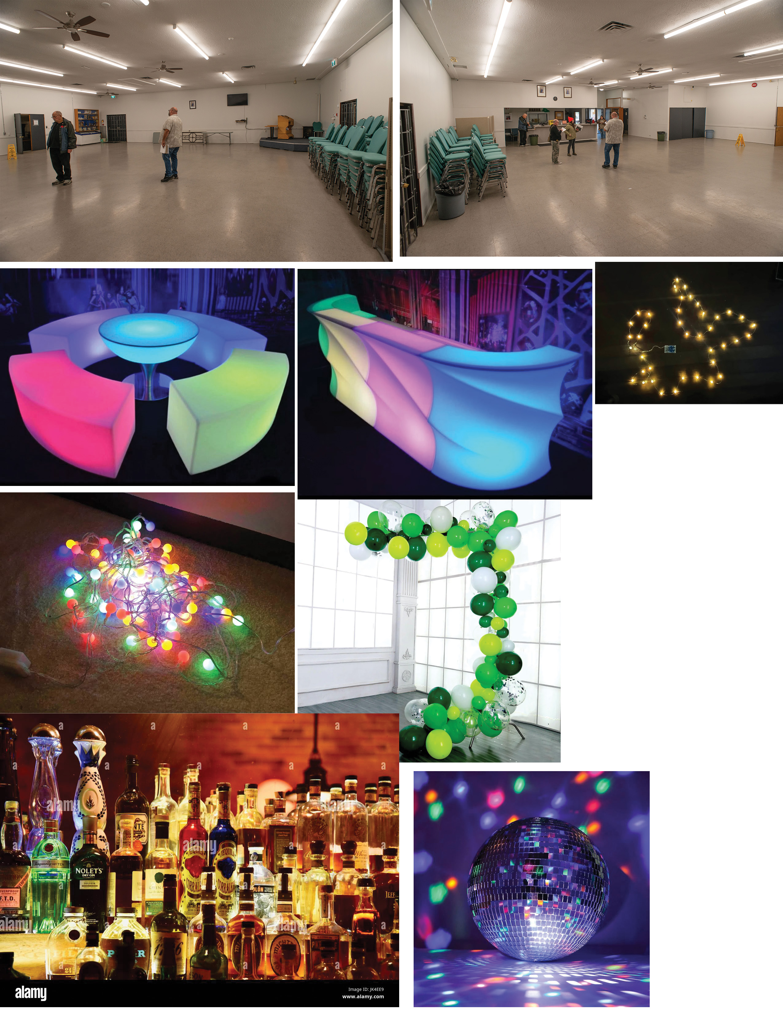event room with bar six illuminated plastic tables twinkle lights disco ball balloon arches backlit bar bottles nightclub lighting