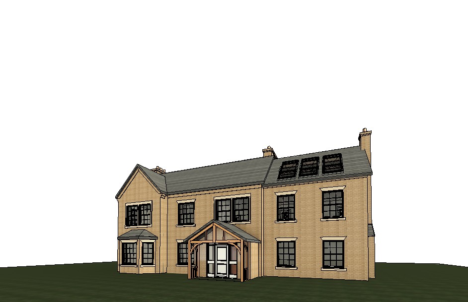 make this into a photorealistic render set in the summer with green trees as a background bricks are michel mersh danehill yellow roof tiles are grey slate tiles