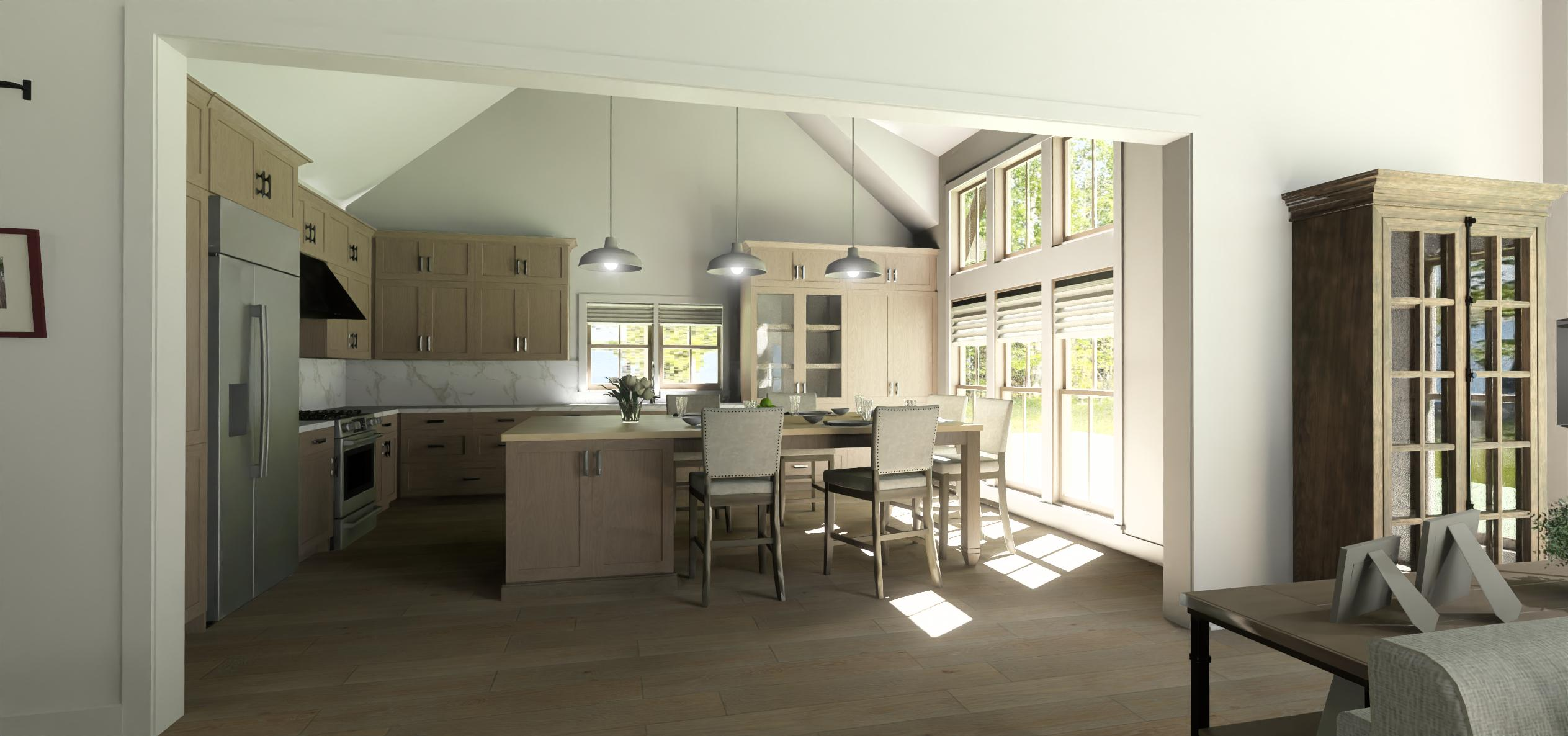 change tile to cream 4x4 backsplash refrigerator front should be a panel to match the cabinets remove bar stools pendant lights should have a fabric shade remove track lighting remove range hood