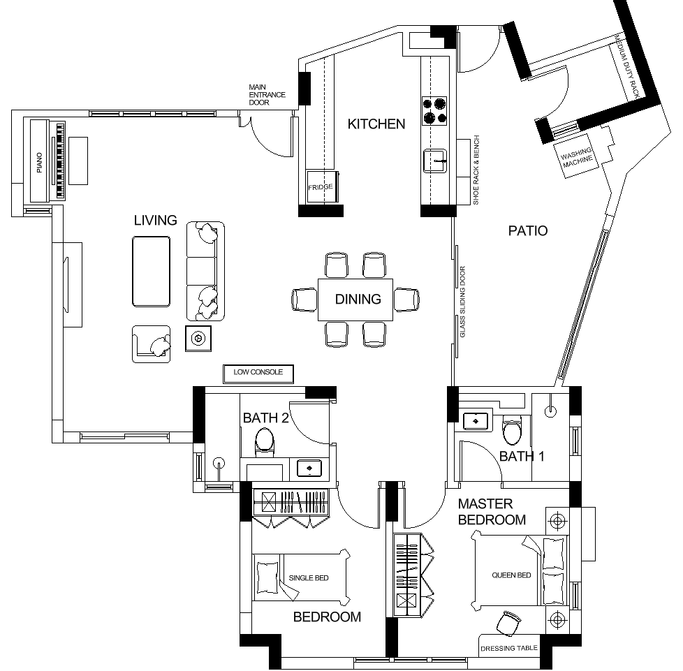 convert this floor plan into a modern isometric 3d view of a full house show the space from an elevated angle with furniture walls and details visible render a modern apartment layout with smooth elegant lines use a soft light neutral color palette with off white colour for the walls and oak vinyl tile for the flooring the living room to have a cozy cream sectional sofa and a plush beige rug add a sleek minimalist kitchen with glossy white cabinets and a marble countertop dark walnut dining table for the bedrooms use soft warm bedding and light curtains that allow natural light to pour in all windows are half height sliding windows half height windows at the patio without curtains with a washing machine as indicated bathroom to be simple in warm white wall tiles and light grey floor tiles all doors to be in oak wood laminate finish piano set to be in black glossy finish console to have a display piece set a serene and airy atmosphere with subtle ambient lighting use the same furniture as shows on the plan do not change the orientation of the floorplan