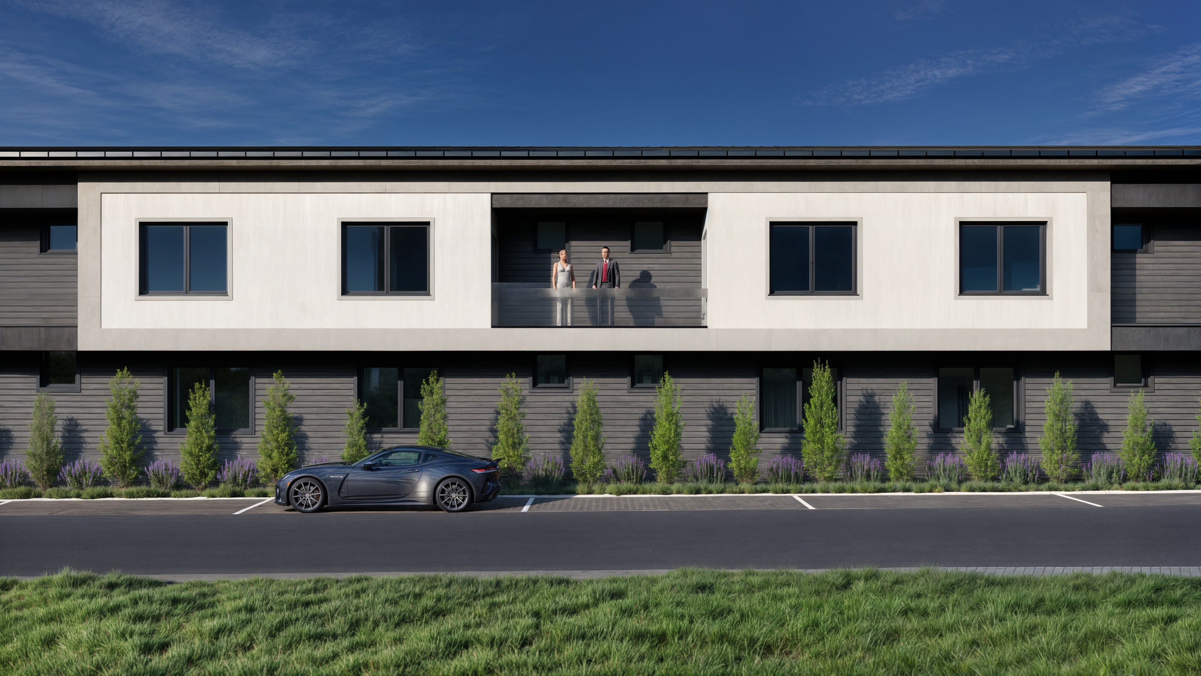 a modern residential building facade with a clean white plaster upper volume and dark rich toned wooden cladding at the ground level the architecture is minimal and well balanced with a strong horizontal composition recessed balcony and evenly spaced windows the wood has a deep warm tone that contrasts elegantly with the light facade enhancing the premium aesthetic the scene is illuminated with warm soft natural light creating a cozy and inviting atmosphere the lighting has a subtle golden hue with soft shadows and gentle highlights that enhance textures and architectural depth the asphalt road and parking area appear slightly wet with delicate reflections adding realism and a refined visual quality a row of vertical greenery lines the base of the building creating rhythm and softening the facade a parked car adds realism and scale while two people standing on the balcony bring life to the composition the overall mood is cozy modern and high end with a photorealistic architectural visualization warm ambiance and a calm welcoming residential environment